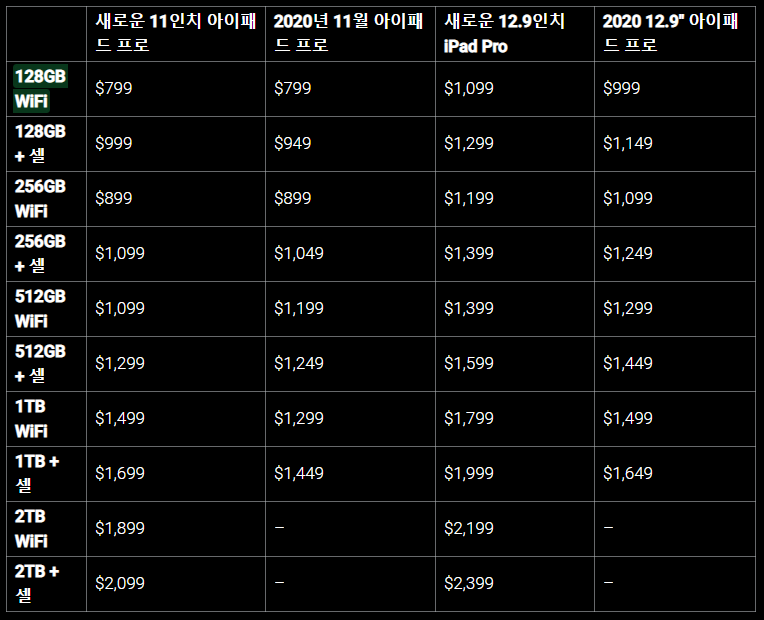 새로운 11인치 아이패드 프로 와이파이 모델은 2020년형 아이패드 프로와 같은 799달러에서 시작되지만, 셀룰러 5G 모델은 현재 200달러(150달러 대신) 업그레이드 되고 있는데, 이는 일부 모델이 지난해 아이패드 프로보다 50달러 더 비싸다는 것을 의미한다. 이와 함께 12.9인치 아이패드 프로는 2020년형 아이패드 프로보다 100~150달러 더 많이 시작한다.