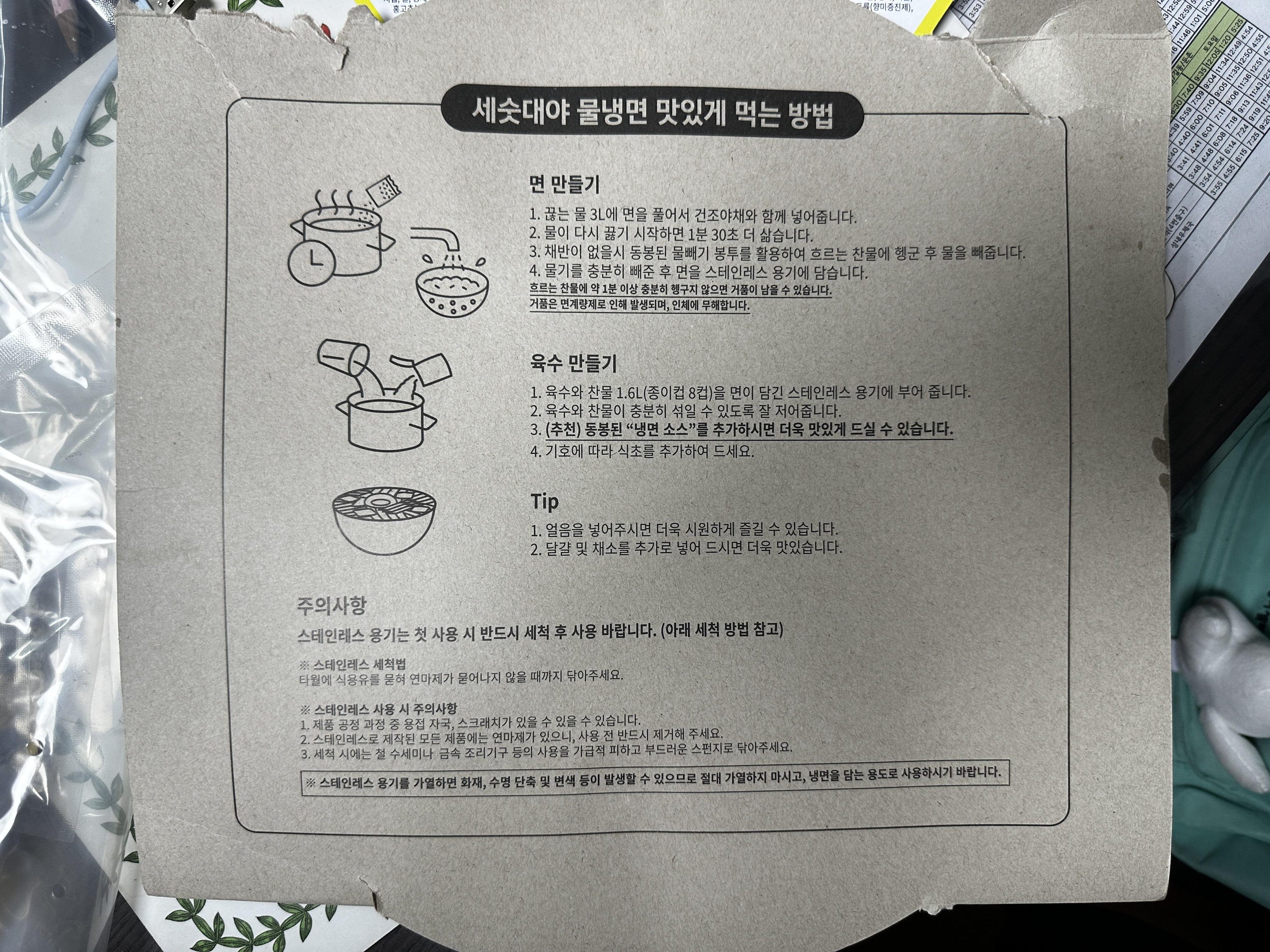 겉에 표지 뒤면에 세숫대야 물냉면 맛있게 먹는 방법이 나와있습니다.