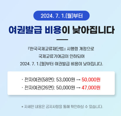 「한국국제교류재단법」시행령 개정에 따라 여권 발급신청 시 납부하던 국제교류기여금이 인하*되어, 2024년 7월 1일(월)부터 여권발급 비용이 낮아집니다.