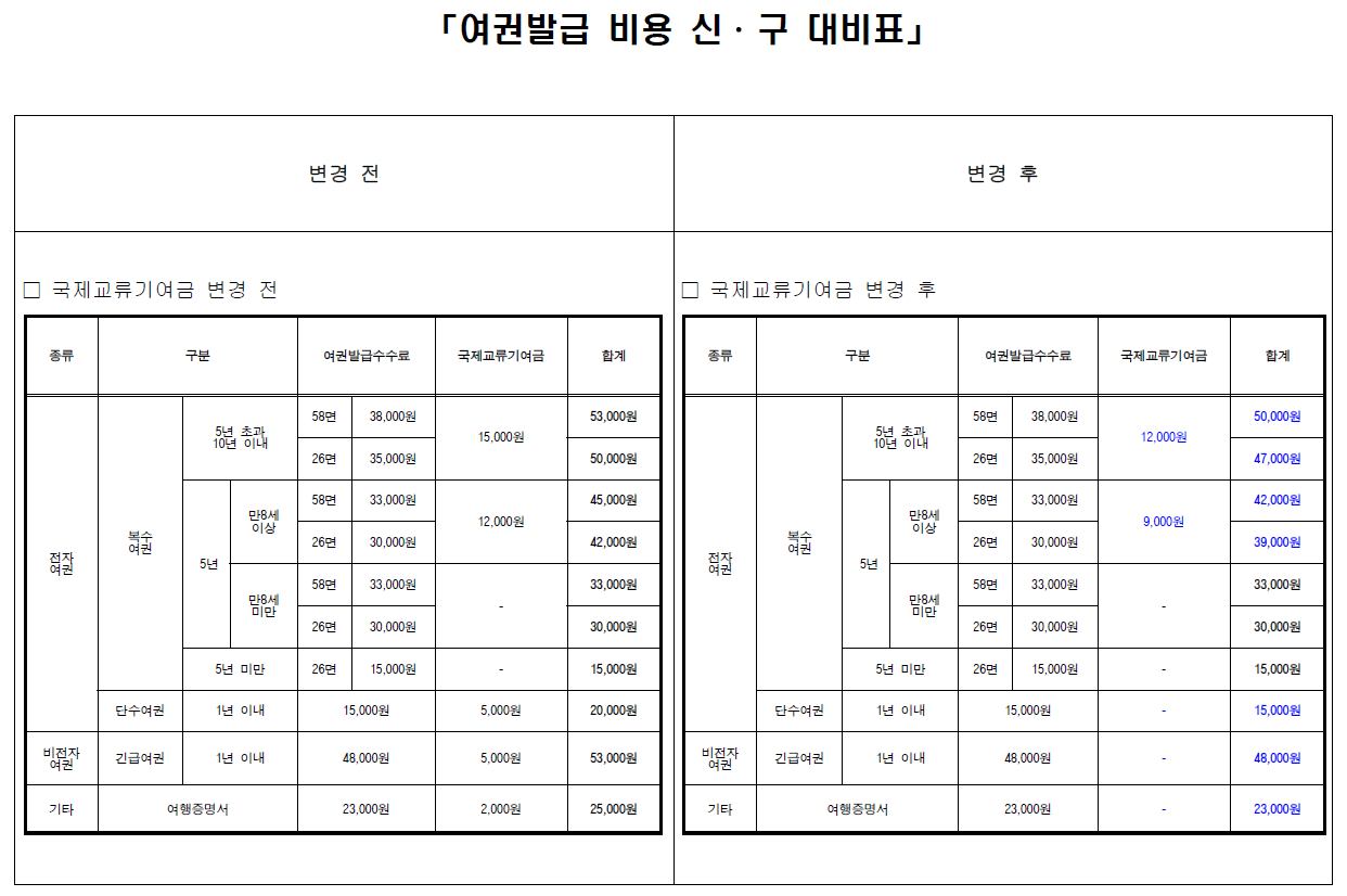 1. 복수여권 : 국제교류기여금 3,000원 인하
