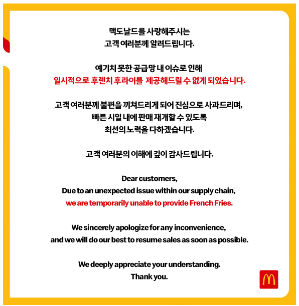 맥도날드를 사랑해주시는 고객 여러분께 알려드립니다. 예기치 못한 공급망 내 이슈로 인해 일시적으로 후렌치 후라이를 제공해드릴 수 없게 되었습니다. 고객 여러분께 불편을 끼쳐드리게 되