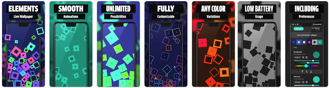 Elements Live Wallpaper로 화면을 우아하고 세련된 걸작으로 바꿔보세요. 이 역동적인 배경화면은 당신의 감각을 사로잡을 떠다니는 대화형 애니메이션 다채로운 사각형으로 장치에 생명을 불어넣습니다.