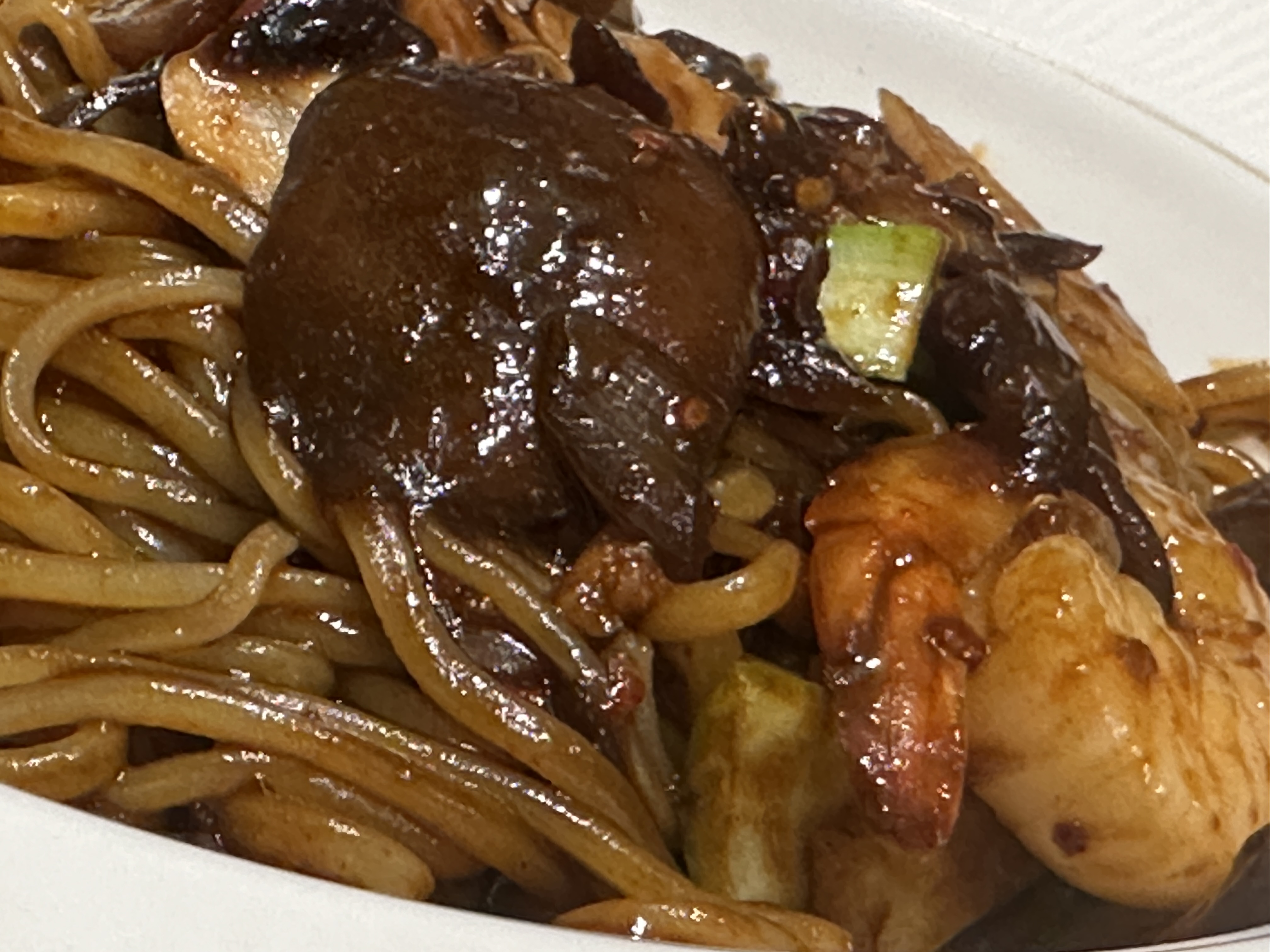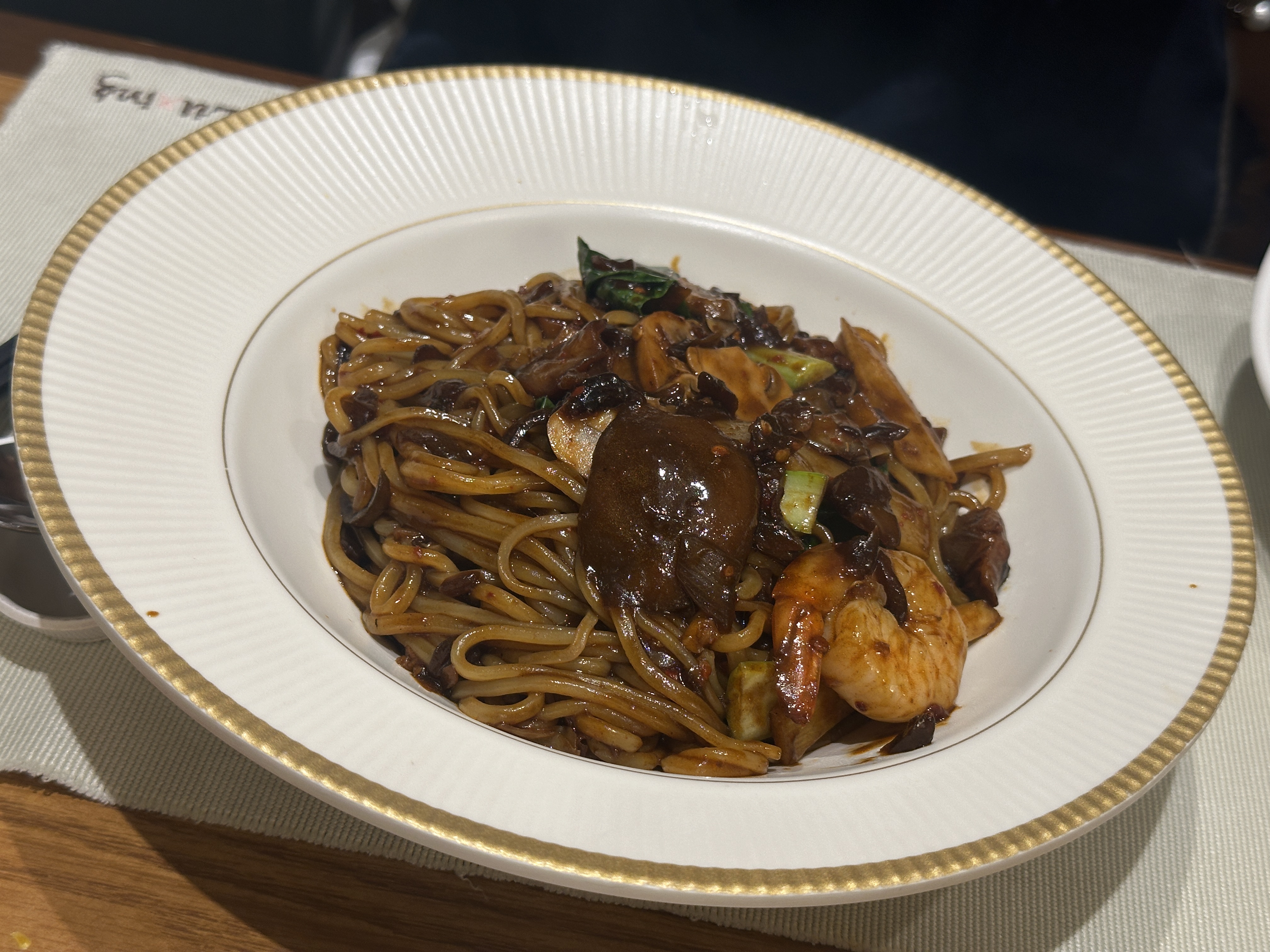 사실 오늘 식사 중 가장 만족스러웠던 음식은 바로 매콤한 볶음짜장면이었습니다. 비주얼부터가 마음에 쏙 들었는데요, 간짜장에 가까운 짜장 소스가 듬뿍 뿌려져 있고, 청량한 느낌의 청경채와 도톰한 새우살이 눈에 띄었습니다. 면은 투박하지 않은 얇은 면으로, 중간 중간 얇게 썬 청양고추가 보였는데, 이것이 식욕을 더욱 돋워주었습니다.