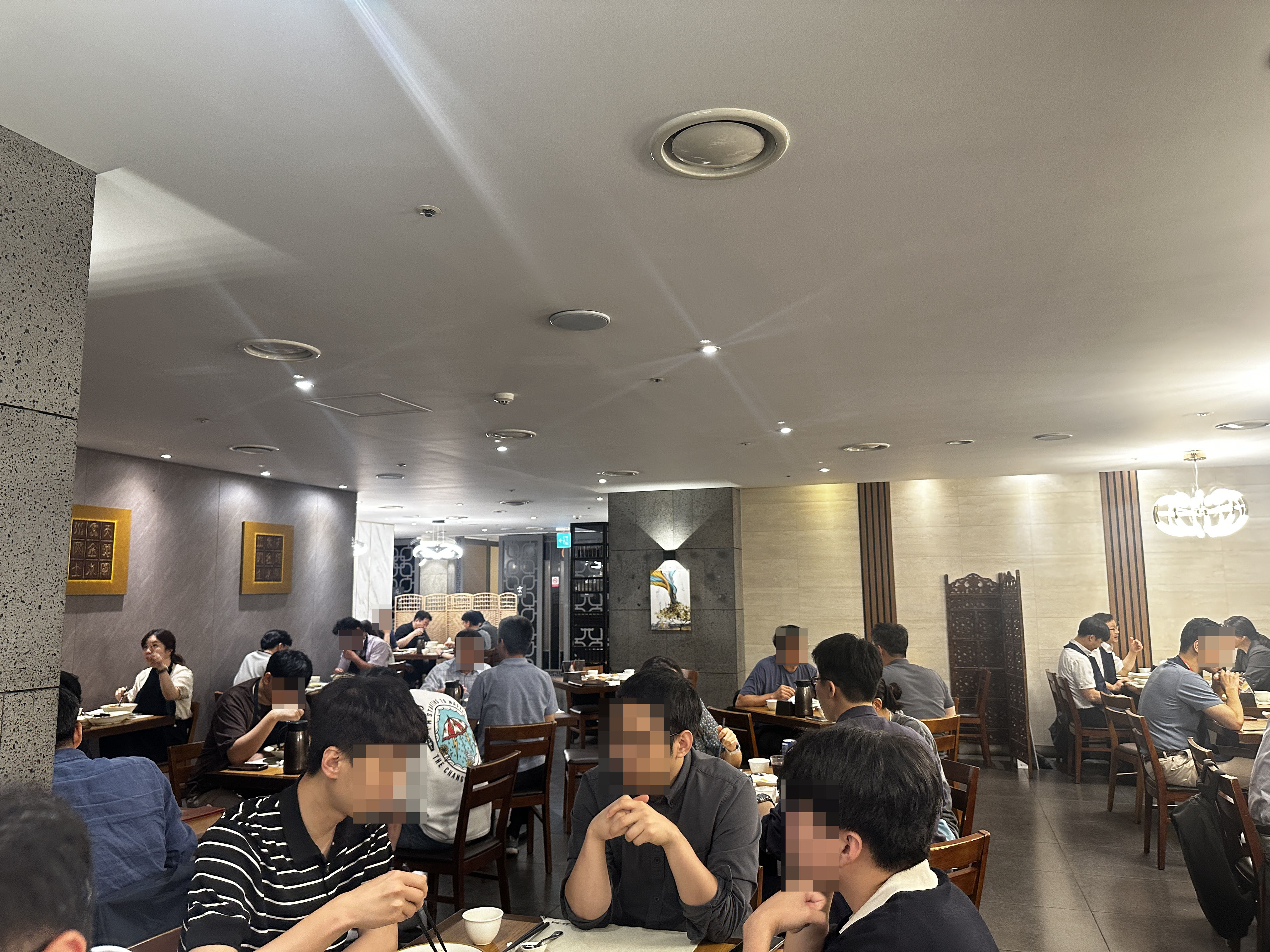 루씽의 실내는 고급스럽고 넓은 분위기가 인상적입니다. 층고가 높아 개방감이 있지만, 그로 인해 소리가 많이 울리는 편입니다. 주변 테이블의 대화 소리나 아이들의 웃음소리가 더 크게 들릴 수 있어 약간 소란스러울 수 있습니다. 하지만 전체적으로 밝고 깔끔한 인테리어는 식사하는 동안 편안한 느낌을 줍니다.