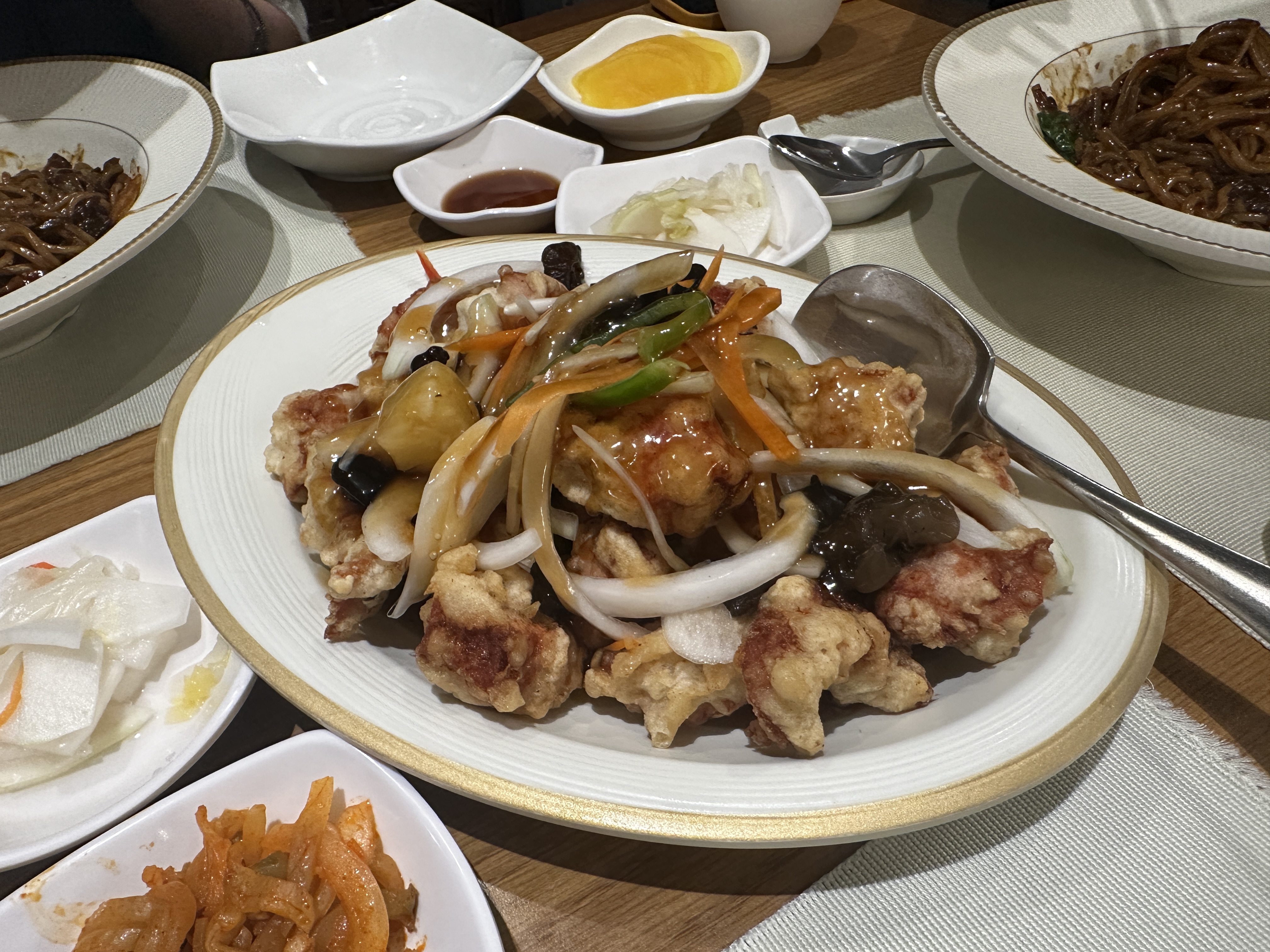 탕수육은 대자로 주문했는데, 상당히 두툼한 고기로 튀겨져 식감이 아주 좋았습니다. 특히 탕수육 소스에 파인애플이 들어가 있어 달콤한 맛이 더해졌습니다. 파인애플이 들어간 소스를 좋아하는 저에게는 완벽한 선택이었습니다. 군만두는 바삭하게 잘 튀겨져 고소한 맛을 자랑했습니다.