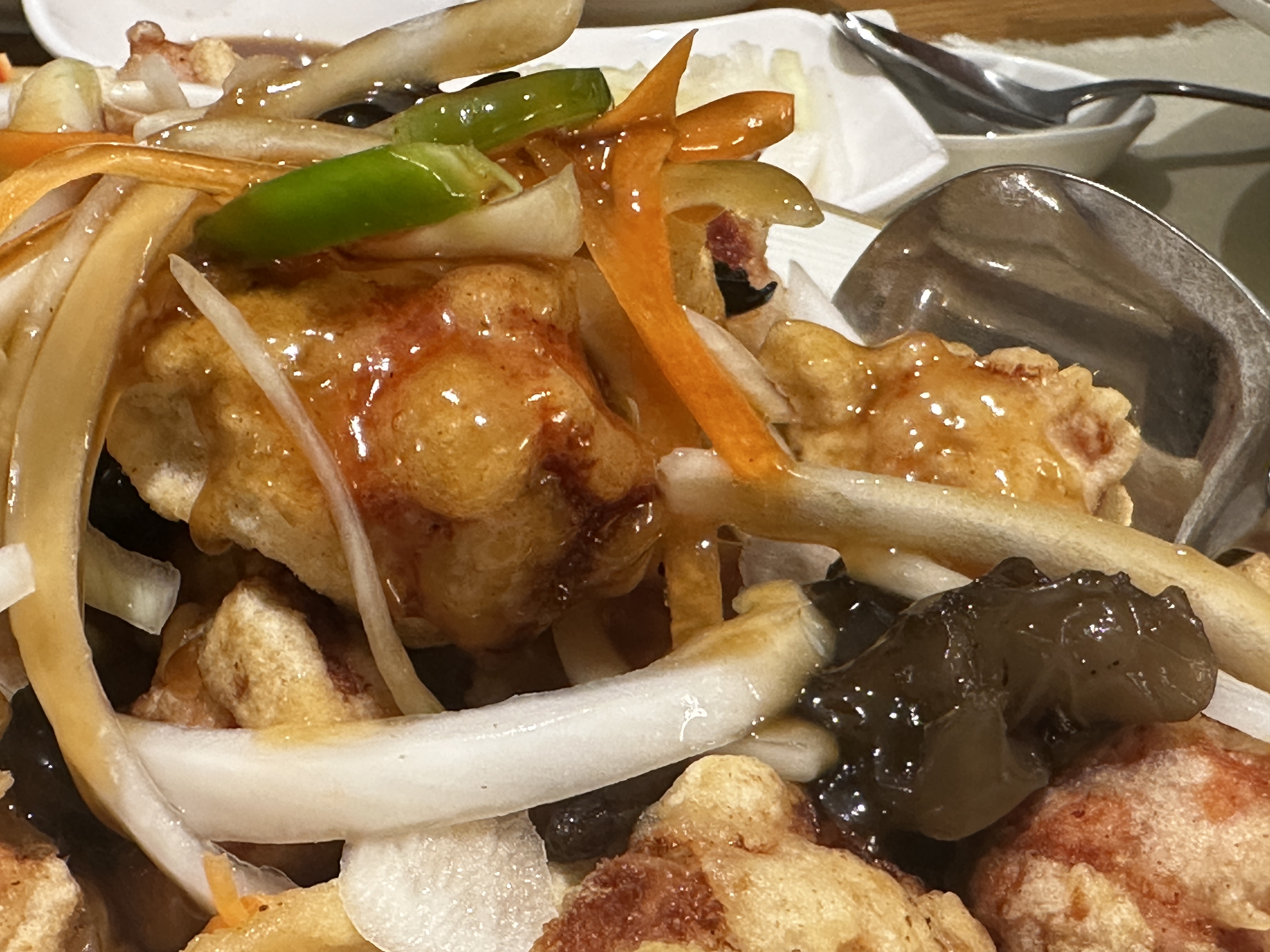 사실 오늘 식사 중 가장 만족스러웠던 음식은 바로 매콤한 볶음짜장면이었습니다. 비주얼부터가 마음에 쏙 들었는데요, 간짜장에 가까운 짜장 소스가 듬뿍 뿌려져 있고, 청량한 느낌의 청경채와 도톰한 새우살이 눈에 띄었습니다. 면은 투박하지 않은 얇은 면으로, 중간 중간 얇게 썬 청양고추가 보였는데, 이것이 식욕을 더욱 돋워주었습니다.