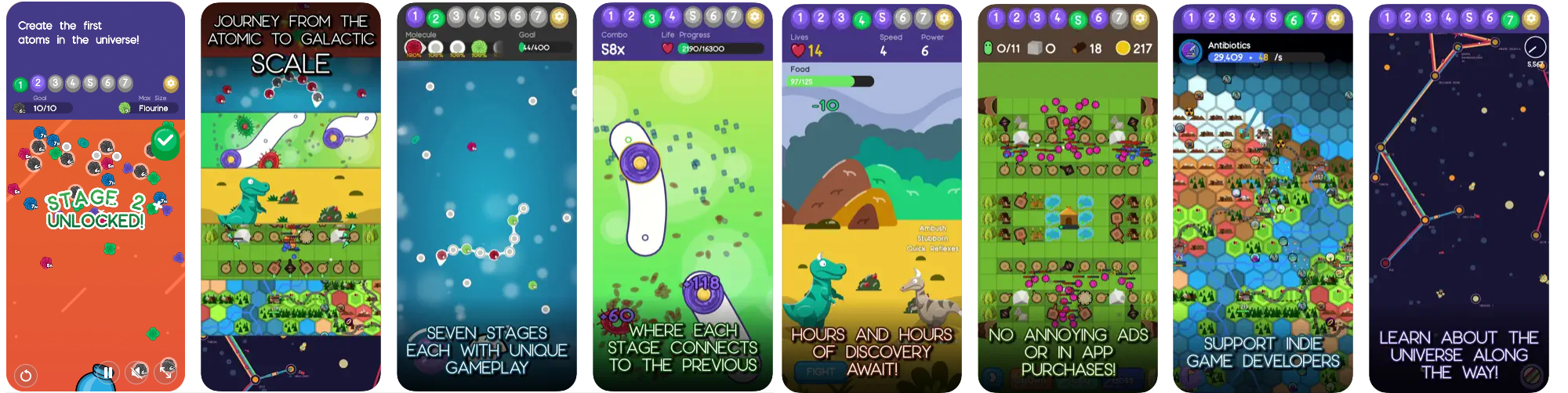 Come explore the Macrocosm, growing from atom to galactic empire along the way! Macrocosm features seven interconnected game stages that give you seven times the bang for your buck. By making progress in each stage you give yourself a boost in the next.