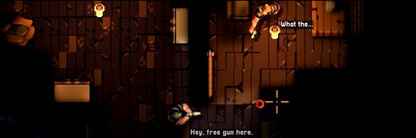 젠장, 들켰군요. 잠긴 문의 자물쇠를 쏴서 열고 들어간 당신의 총이 불을 뿜기 시작합니다. 아드레날린이 솟구치는 총격전 끝에 당신은 목표를 제거하고 간신히 탈출할 수 있었습니다. 잘 했습니다!