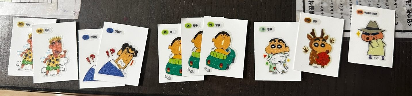 치타 2장, 신영만 2장, 맹구 3장, 짱구 2장, 부리부리 1장 입니다.