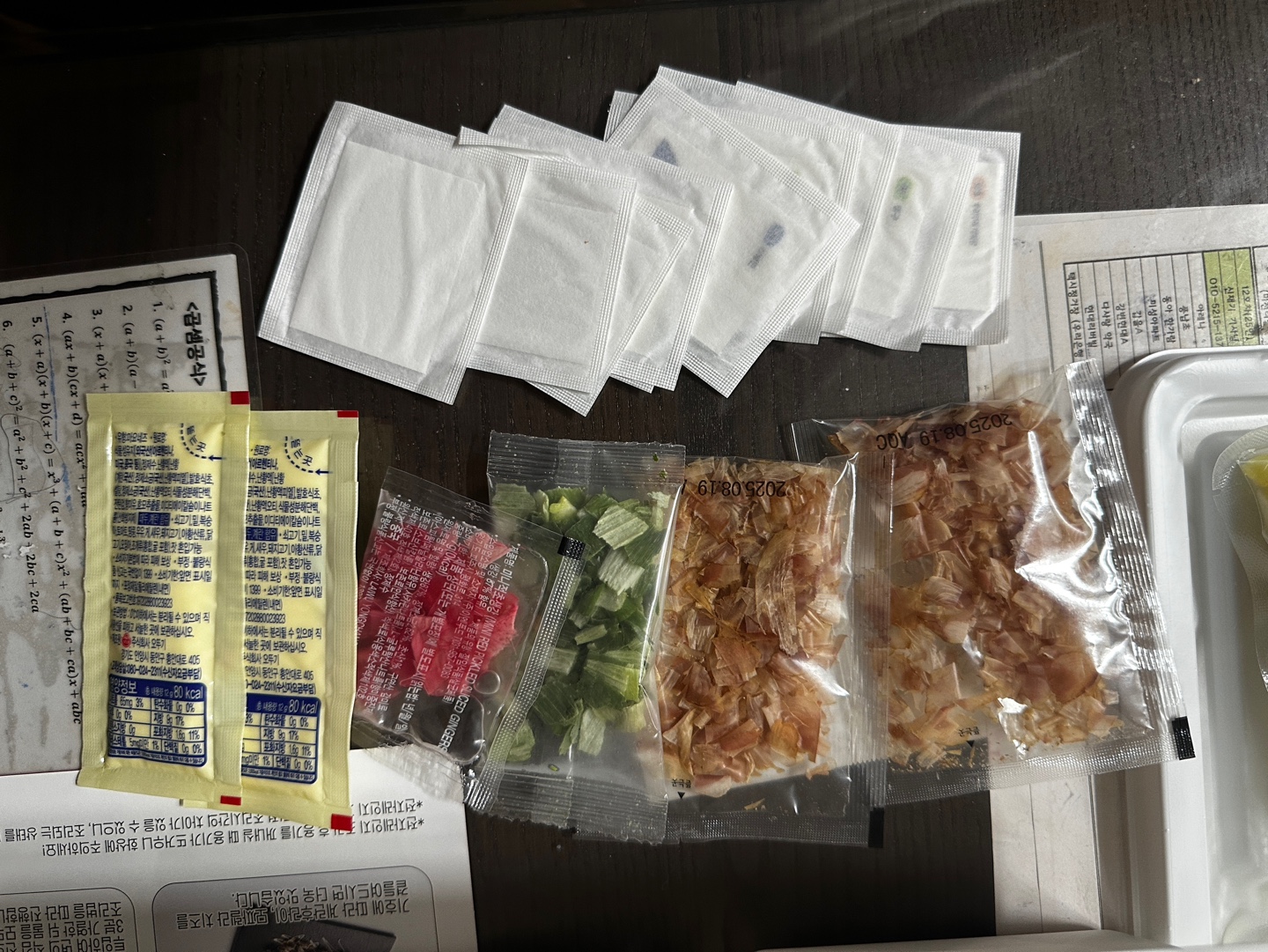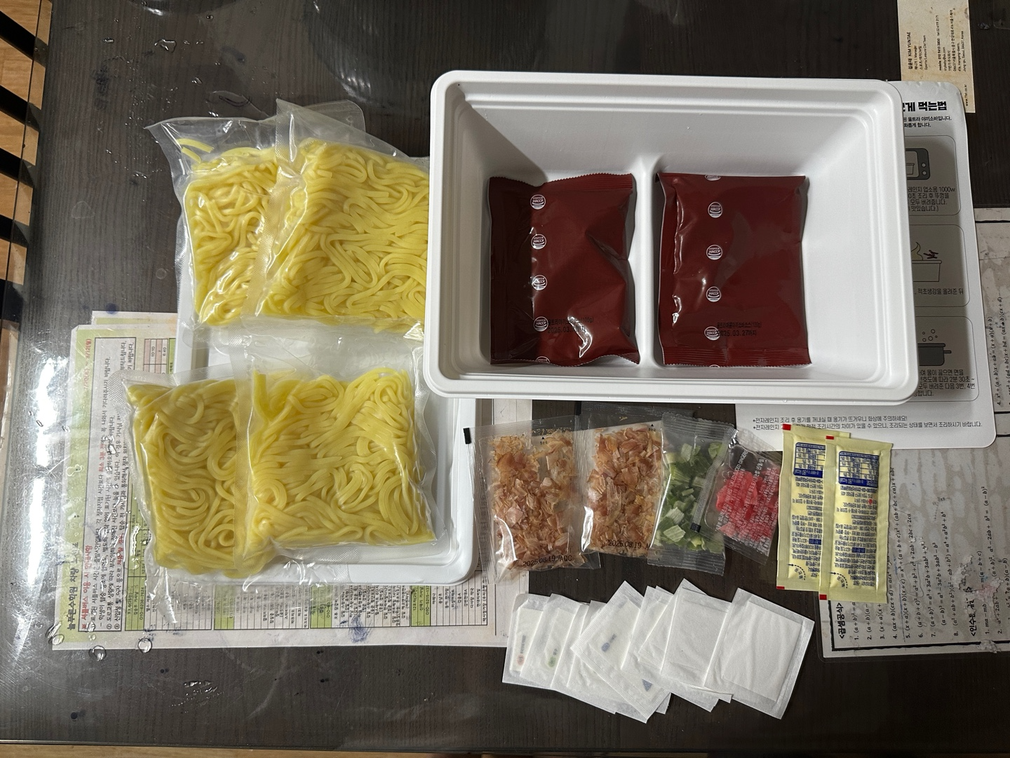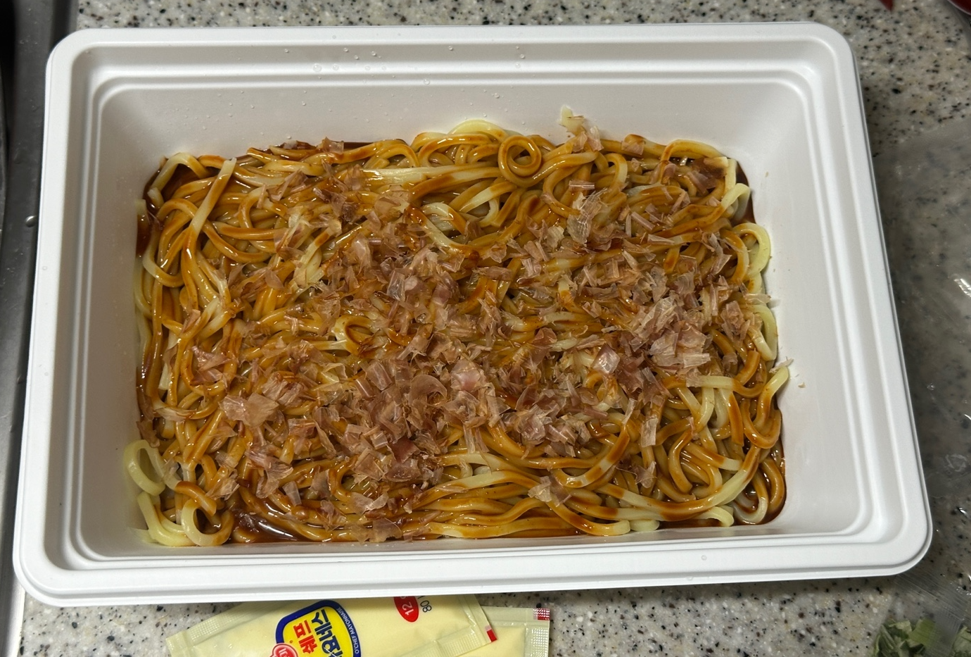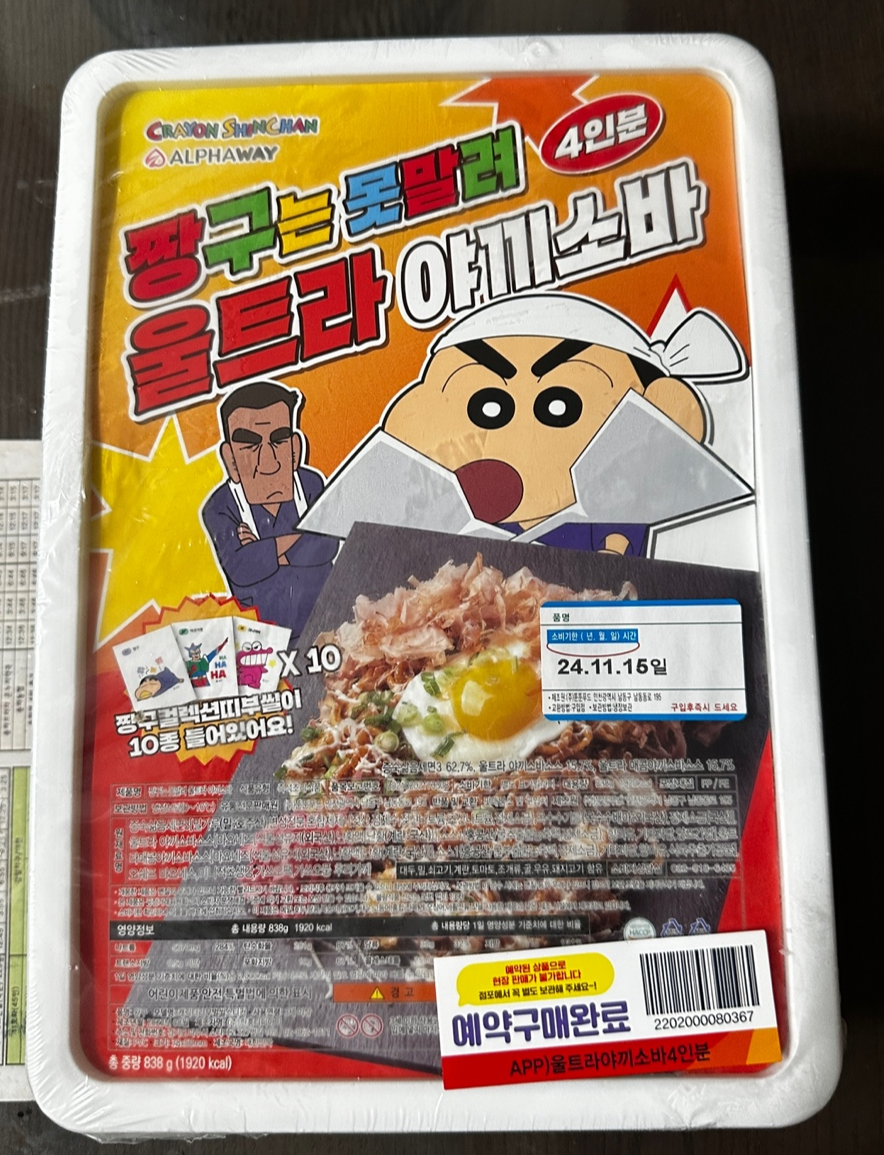 짱구 야끼소바의 구성은 면 4새, 야끼소바소스 2개, 혼다시 2개, 건조파 1개, 초생강 1개, 마요네즈 2개,