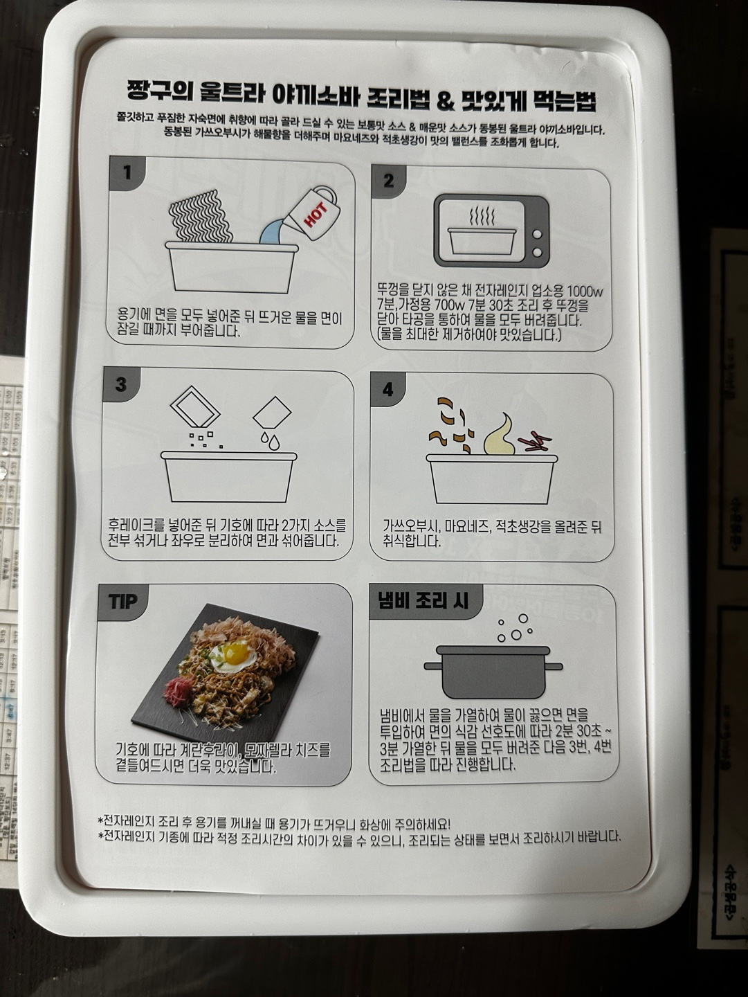 포장 비닐을 벗기고 짱구그림이 있는 간지를 뒤집게 되면, 짱구 야끼소바의 조리법이 나와있습니다.