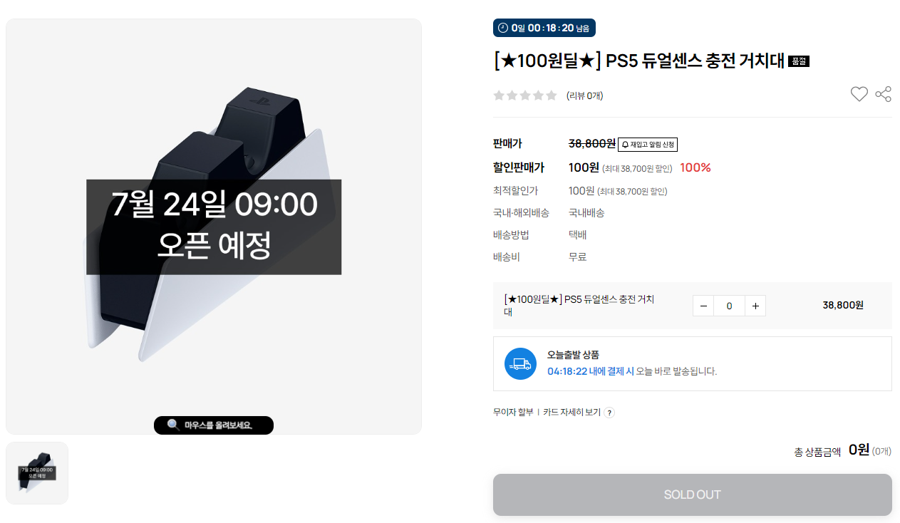 PS5 듀얼센스 충전 거치대를 PS Shop 에서 09시에 100원딜이 진행이 됩니다.