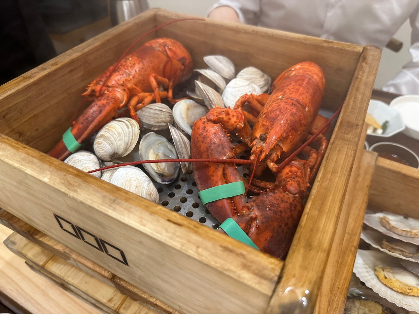 첫 번째 틀에는 랍스터 2마리와 조개가 들어있습니다.