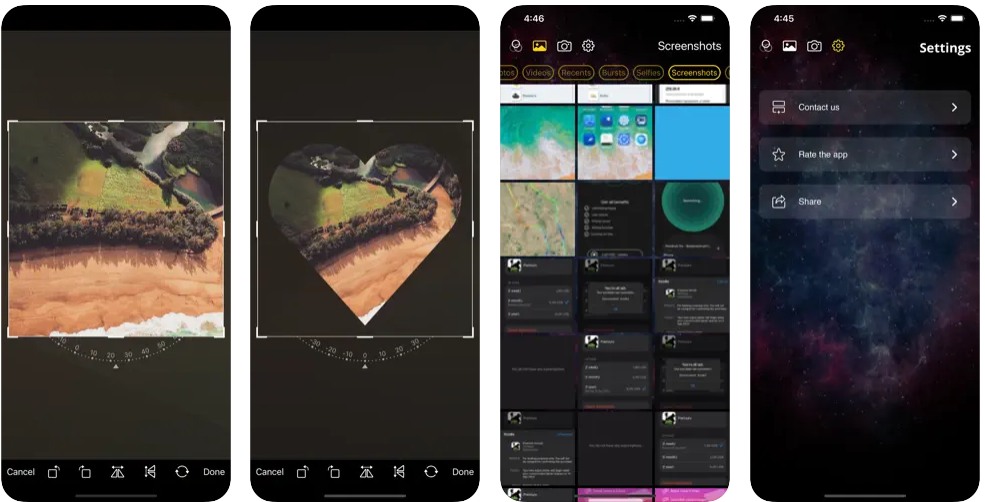 The main functions of the application: - photography - upload from album for editing - drawing on a zoomable photo - photo cropping with different shapes - photo rotation - mirror flip photo - rotation of the photo by an arbitrary angle - brightness adj