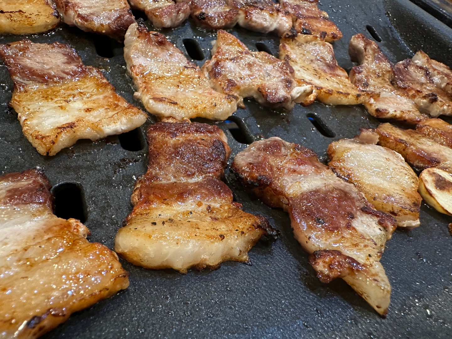 오랜만에 방문을 한 거였는데 이전에 사용하던 불판이 참 오래되었네, 하고 항상 생각했는데, 새로운 불판으로 싹 바뀌어있었습니다. 보통은 가운데에 마늘을 두지만, 아이들이 마늘은 직접 굽고 먹고 싶어 하여 가상자리로 옮겨 주었네요,.