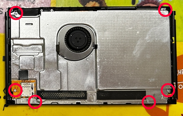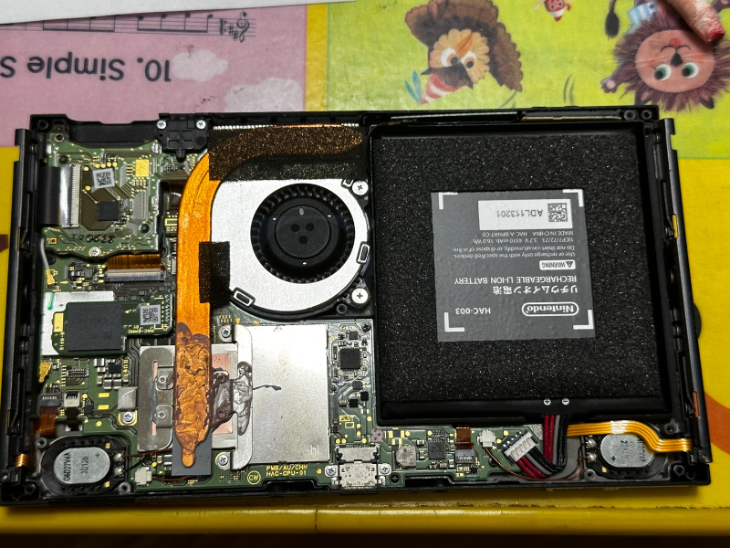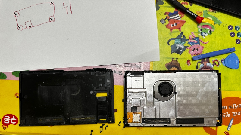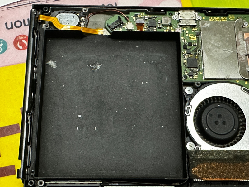 배터리가 제거된 닌텐도스위치의 모습니다. 다시 배터리를 고정하기 위해 테이프가 남아있는 부분은 잘 떼어 내시길 바랍니다.