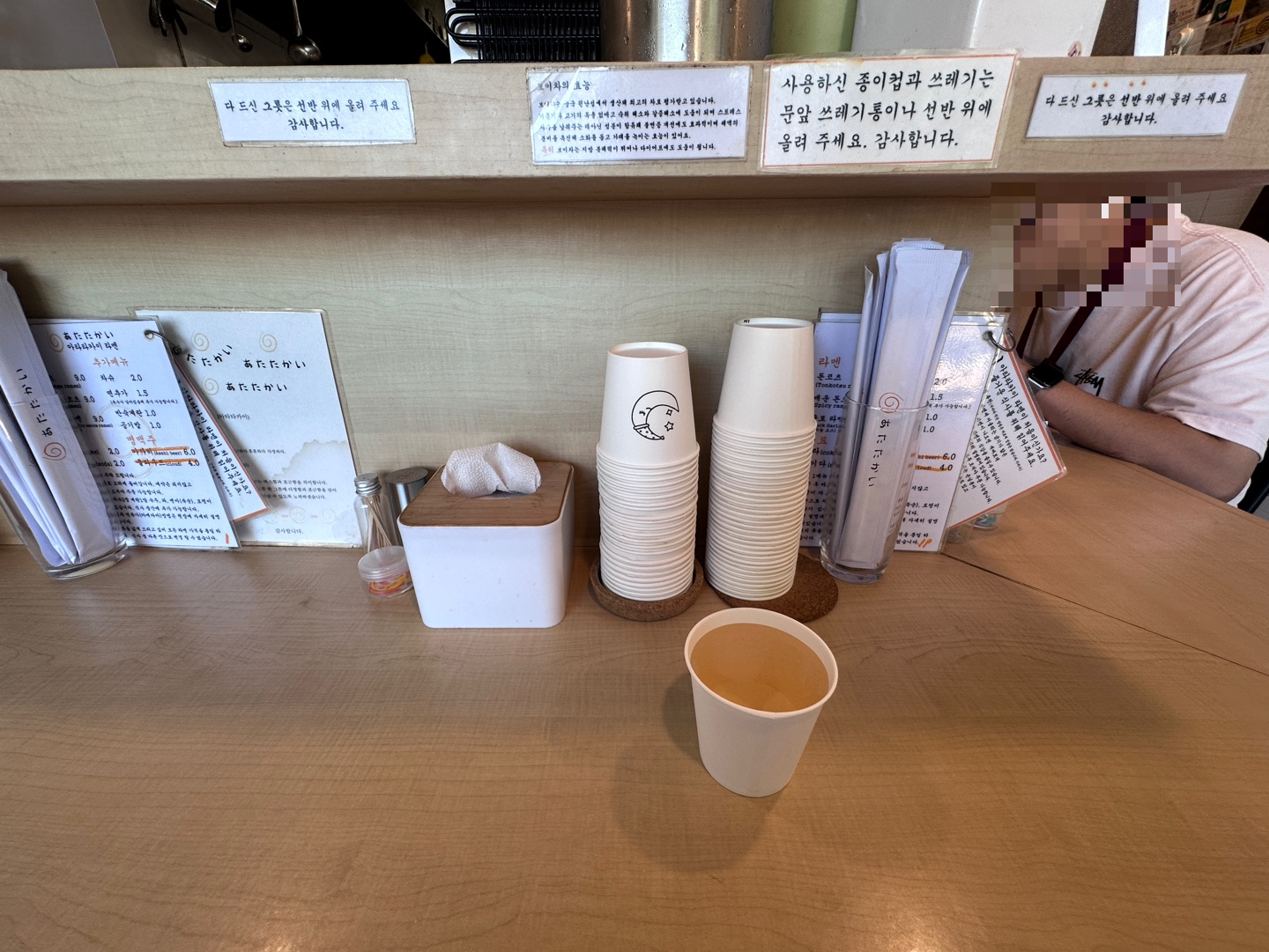 테이블 위에는 메뉴판, 휴지, 젓가락, 물컵(종이컵), 이쑤시개, 후추, 머리끈이 준비가 되어있습니다.