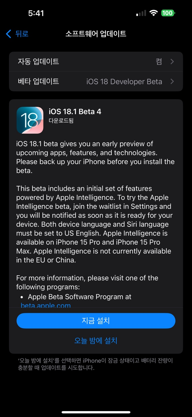 iOS 18.1 Beta 4 업데이트 되었습니다.