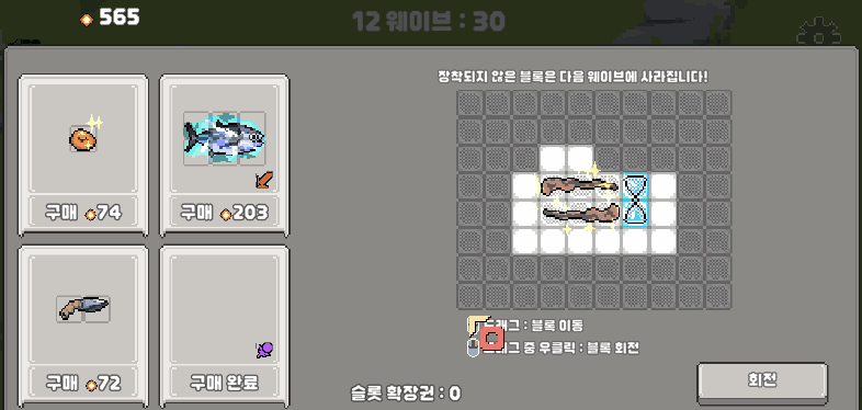 - 무기를 배치하여 적들을 공격하고, 아이템을 배치하여 무기를 강화합니다.
