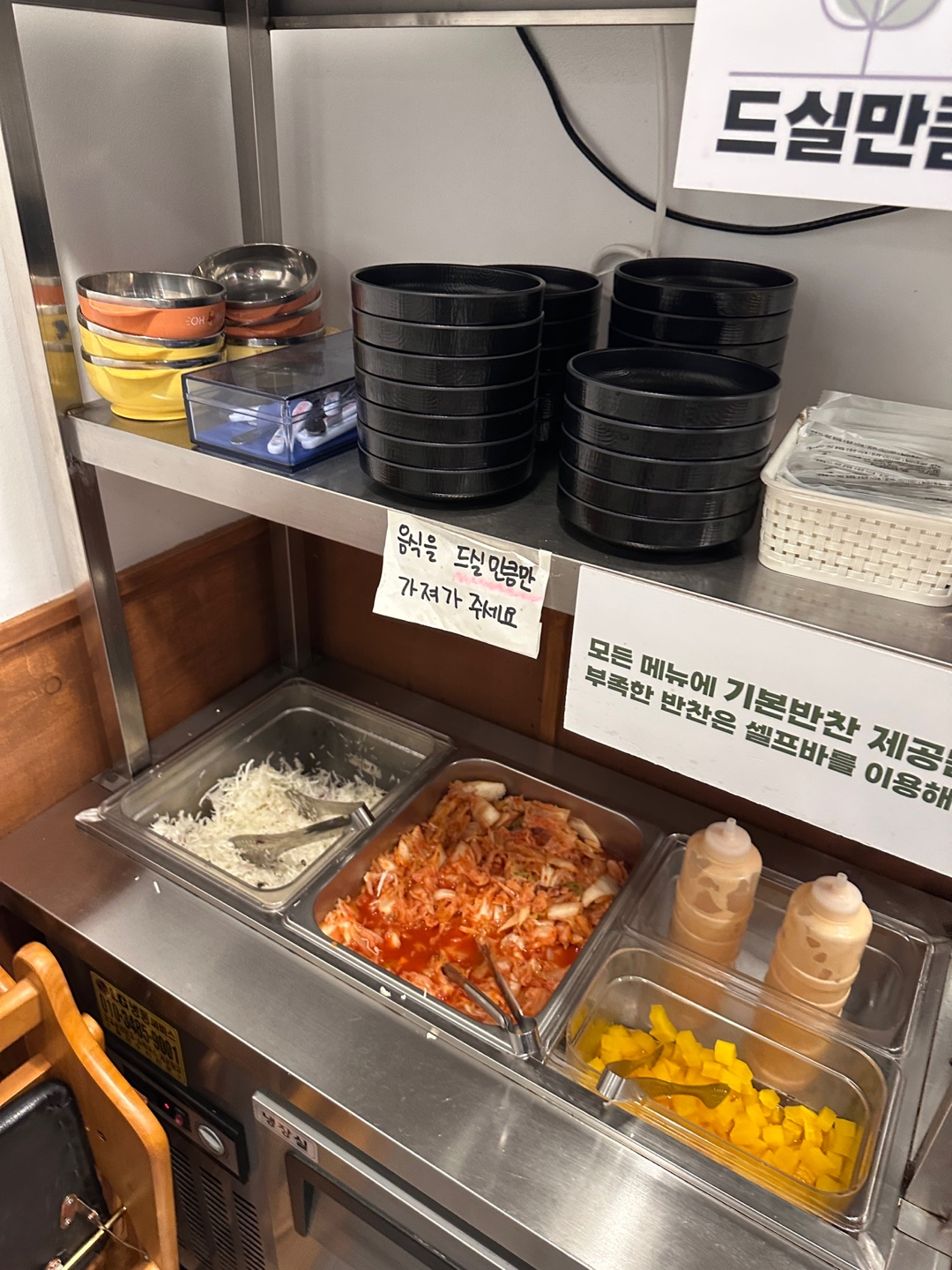 주문을 마치고 자리에 앉자마자 한쪽 구석에 마련된 셀프 코너가 눈에 띄었습니다. 단무지와 김치, 그리고 샐러드가 있었는데, 셀프 서비스로 마음껏 가져갈 수 있어서 무척 편리하더군요.