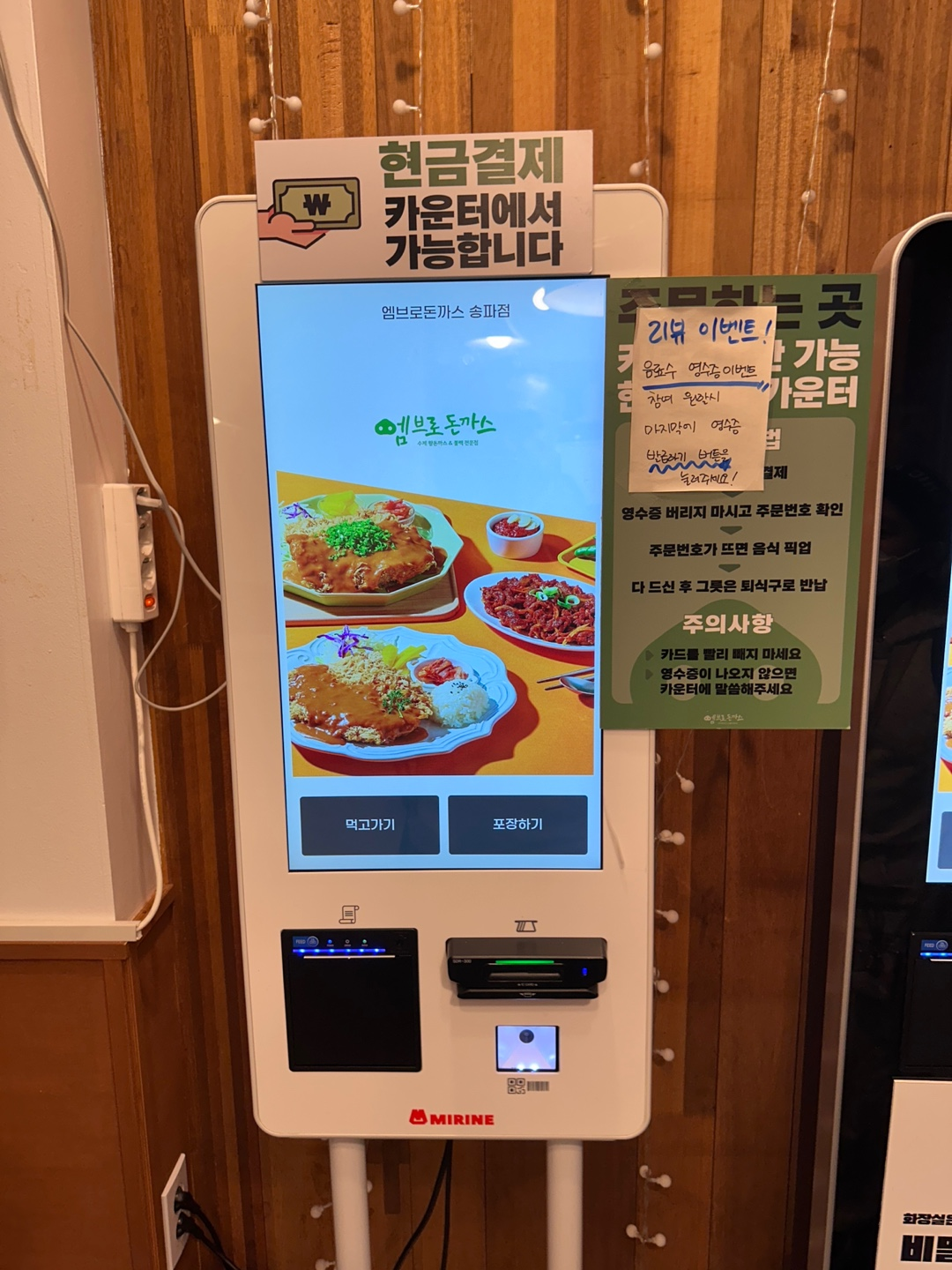 입구에 들어서면 바로 왼쪽에 키오스크 두 대가 눈에 들어옵니다. 여기서 주문을 진행하면 되더군요.
