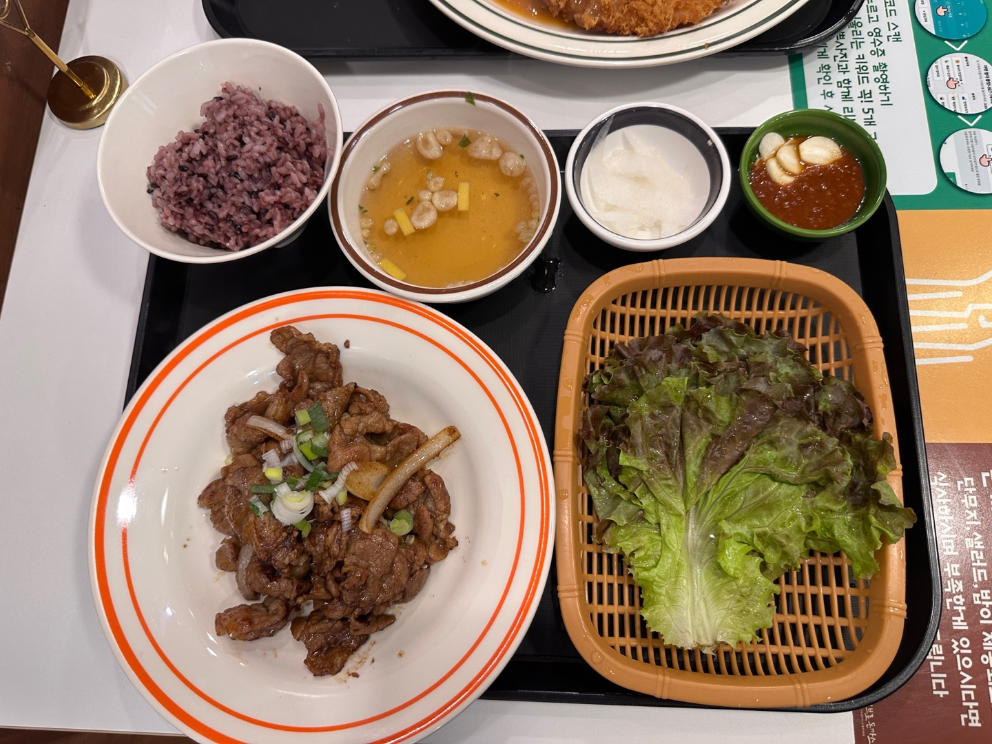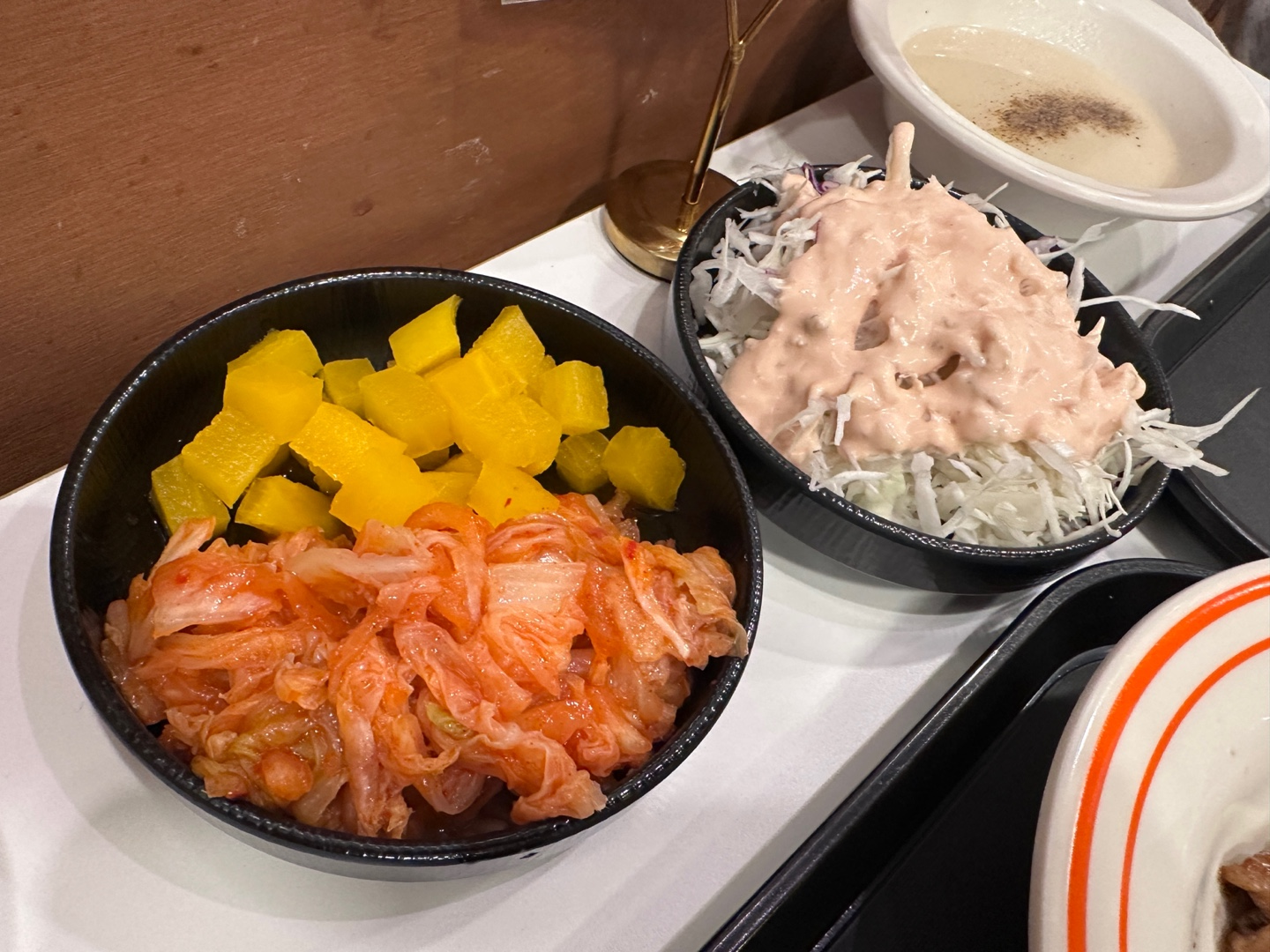 그러니 아이도 저도 샐러드와 김치를 접시에 듬뿍 담아와 기다리는 동안 맛보기로 먹기 시작했습니다. 솔직히 셀프로 원하는 만큼 가져다 먹을 수 있다는 건 정말 큰 장점 같아요. 특히 돈까스에는 아삭한 샐러드나 짭조름한 단무지가 은근 잘 어울리잖아요. 이곳에서 그런 작은 부분까지 신경 써주는 것 같아 점점 기대가 커졌습니다.