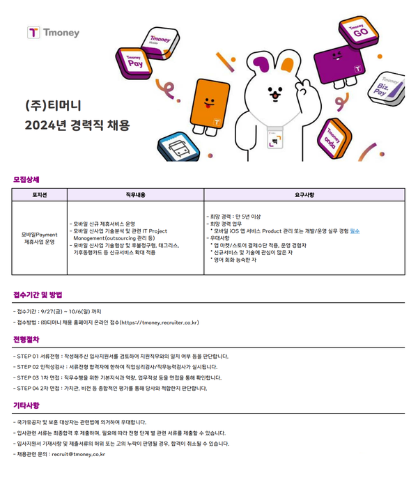 29일 티머니에 따르면 회사는 지난 22일까지 ‘티머니 모바일페이먼트 제휴사업 운영 직무 경력직 채용’을 진행했다. 티머니가 희망한 경력 업무 대상자는 아이폰 모바일 운영체제(OS)인 iOS 앱 서비스 상품을 관리했거나, 개발·운영팀에서 실무 경험을 만 5년 이상 쌓은 자다. iOS 앱서비스 관련 경력 요건은 우대 사항이 아닌 필수 사항이다.