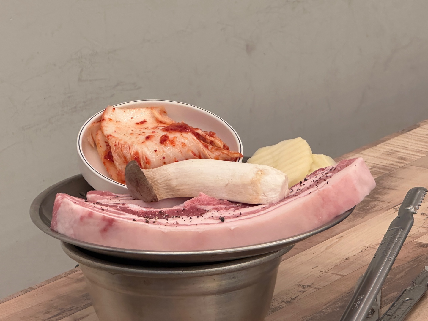 삼겹살과 함께 슬라이스 감자, 버섯, 김치까지 함께 구워주셔서 맛있게 준비 완료!
