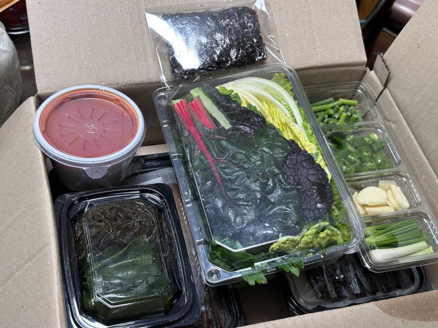 쌈채소, 마늘쫑, 고추, 마늘, 차, 다시마, 해초, 김, 그리고 특제소스까지!