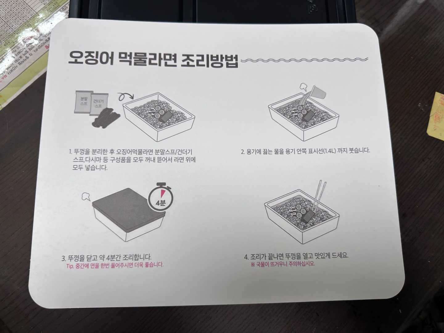 물이 끓자 면과 스프를 넣고, 포장지에 적힌 대로 물의 표시선까지 부은 후 4분을 기다렸습니다.