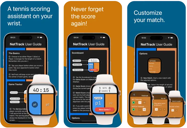 NetTrack transforms your Apple Watch into a tennis scoring assistant. Real-time tracking of: - Game score. - Games won per set. - Serving player. - Deuce number. - Tiebreaks. - Sets won. Customizable match options - Tiebreak: Set and Match tiebreaks. Ch