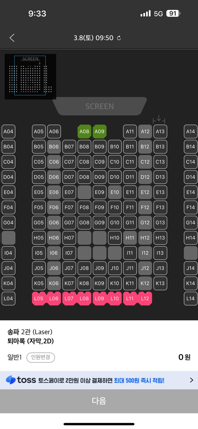 집에서 가까운 CGV 송파점에서 토요일 9:50 조조영화로 예매했습니다.