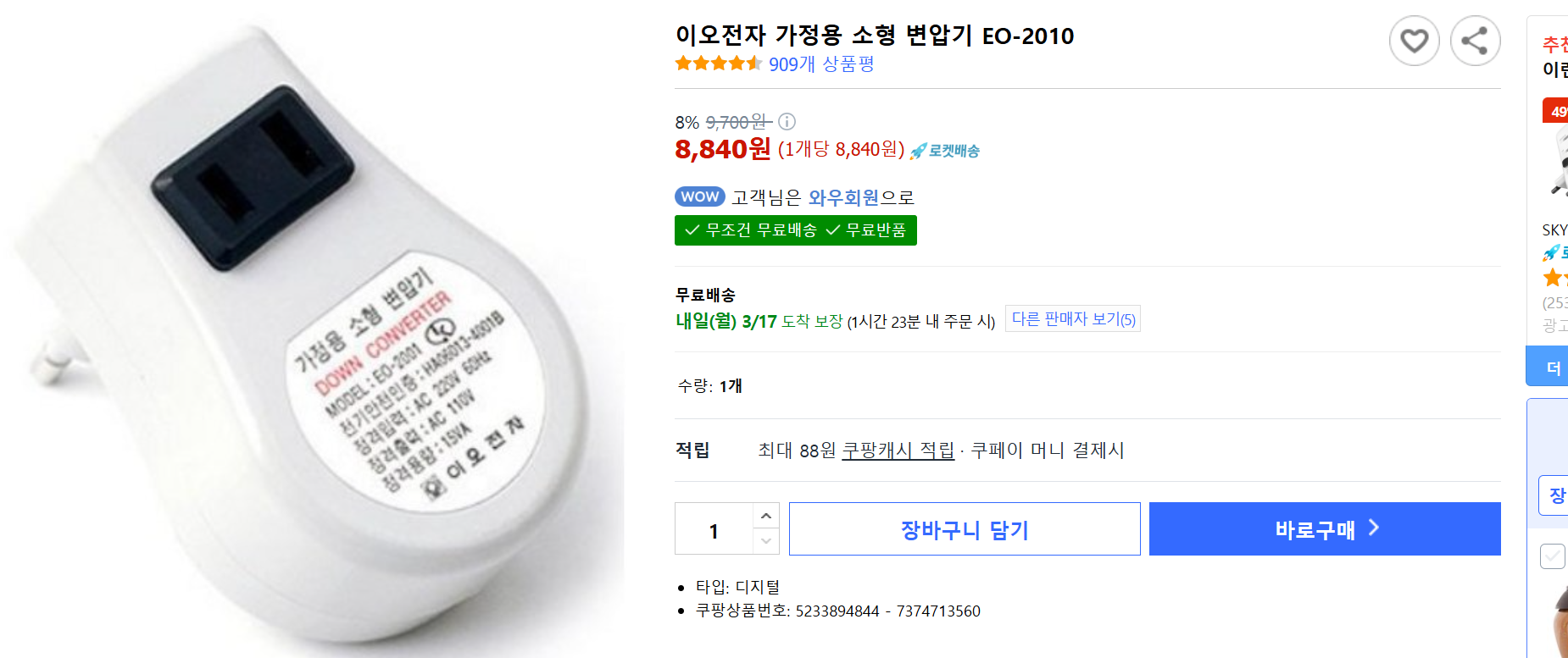 그래서 빠르게 쿠팡 로켓배송으로 이오전자 가정용 소형 변압기 EO-2010을 주문했습니다.