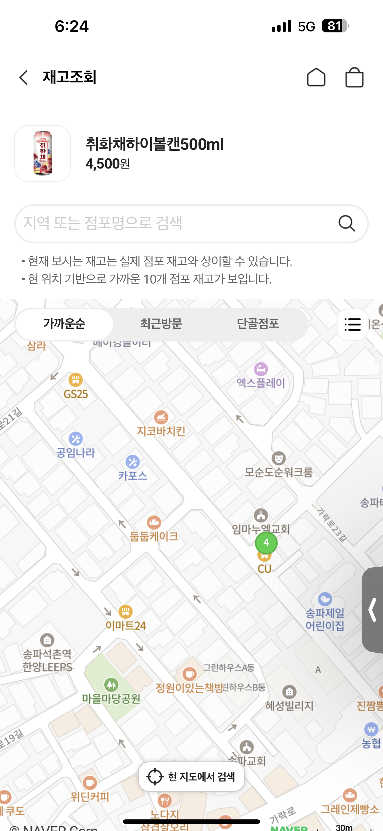 바로 CU 어플을 열어 집 근처 재고 확인을 했습니다.