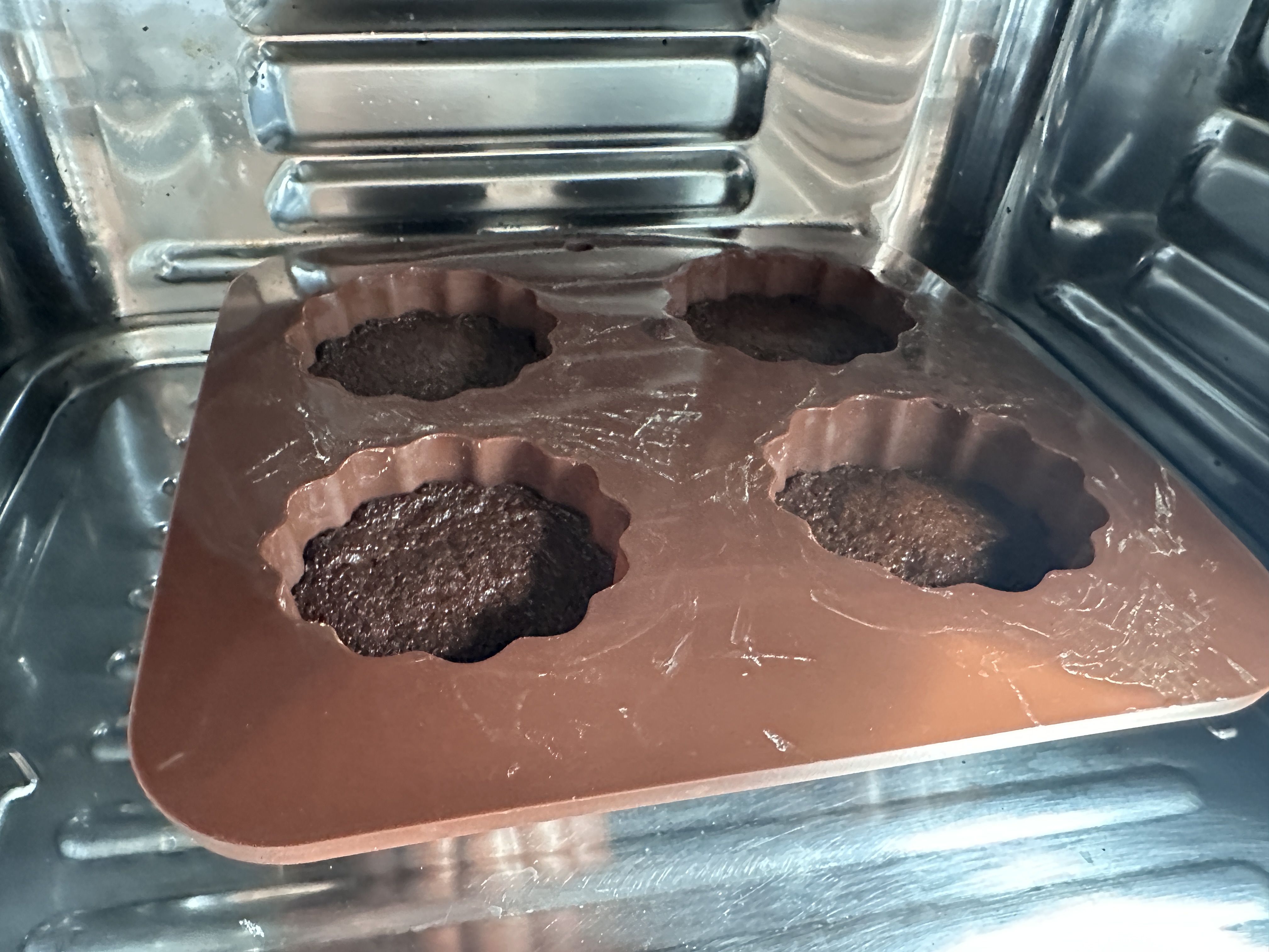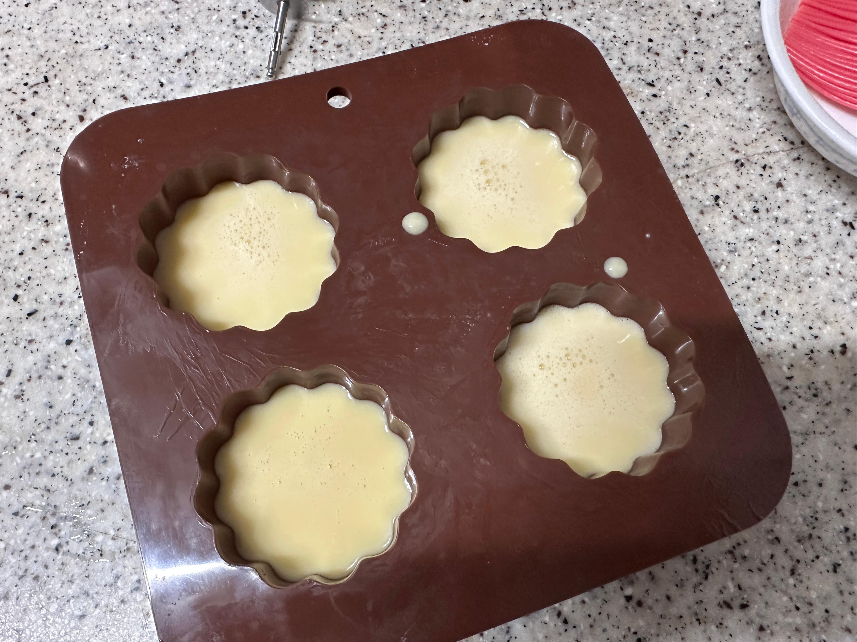 85~90% 정도만 채워야 굽는 동안 넘치지 않습니다.굽기전 까눌레의 모습 - 굽기