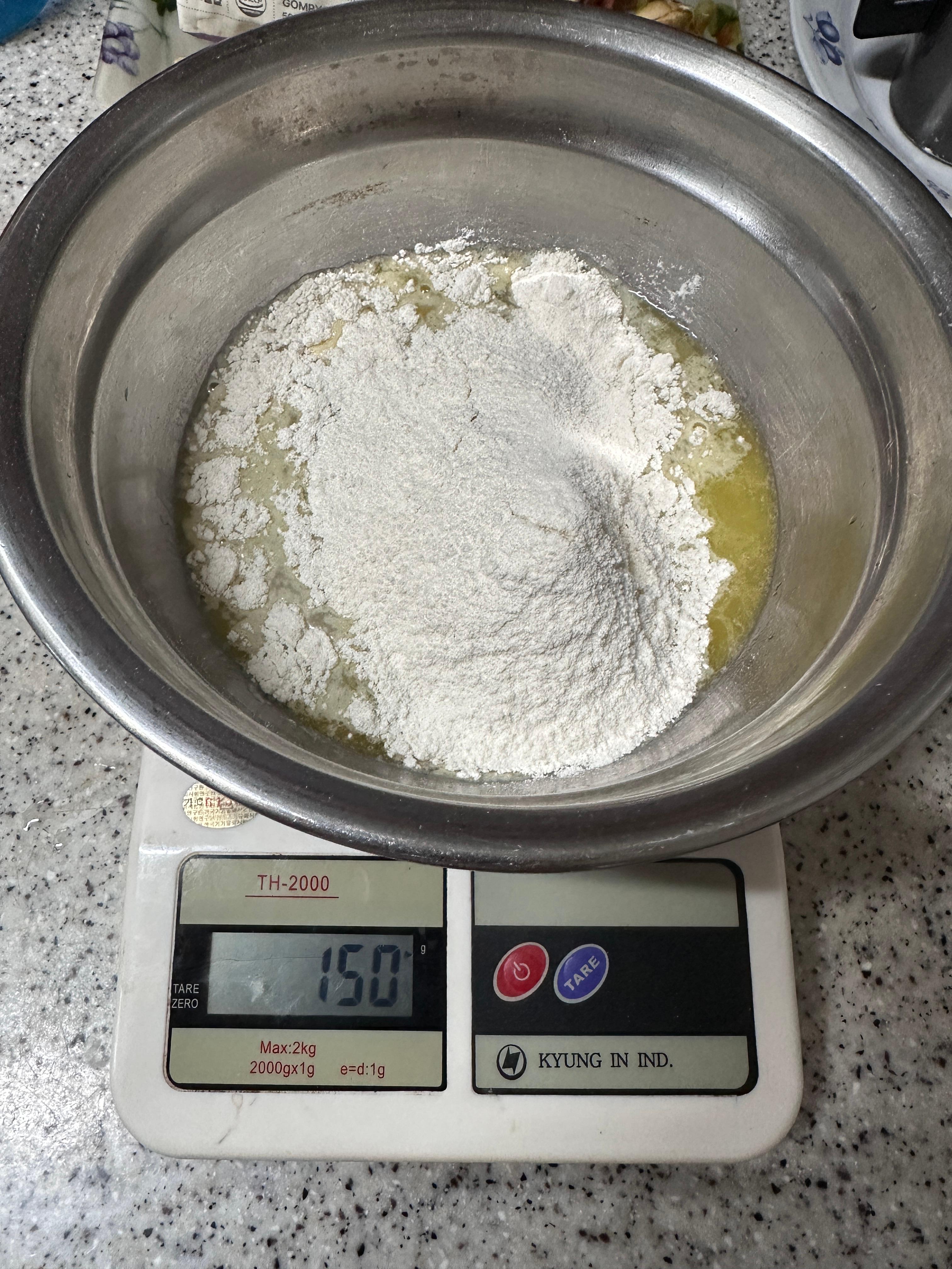 곰표 까눌레 믹스 150g을 정확히 계량해 넣습니다.까눌레 믹스 투하