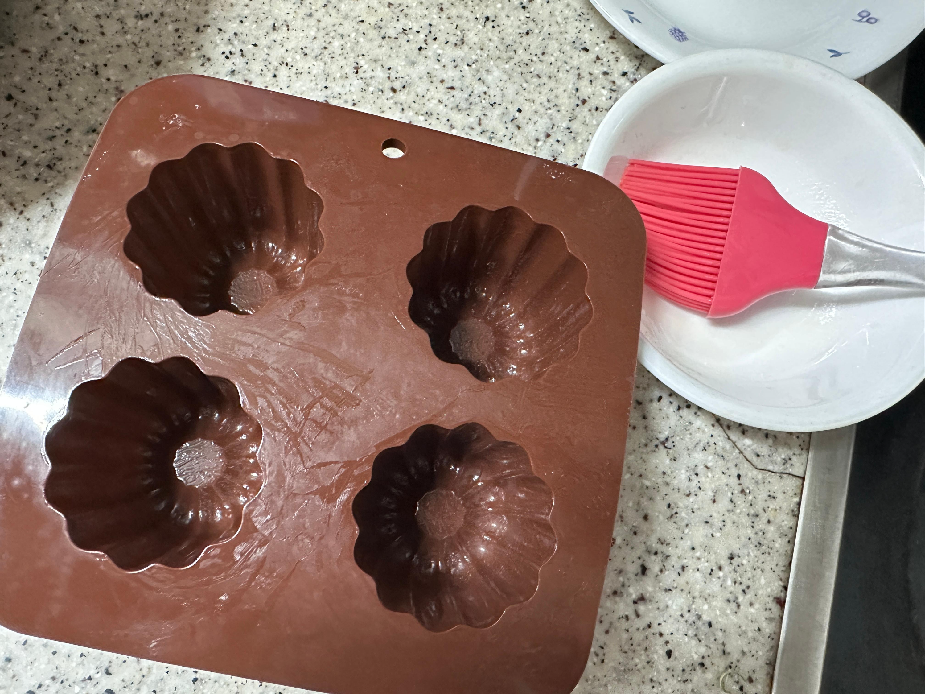 까눌레 틀 안쪽에 골고루 발라줍니다.버터를 발라 주세요~! - 틀에 반죽 붓기 (주의!)