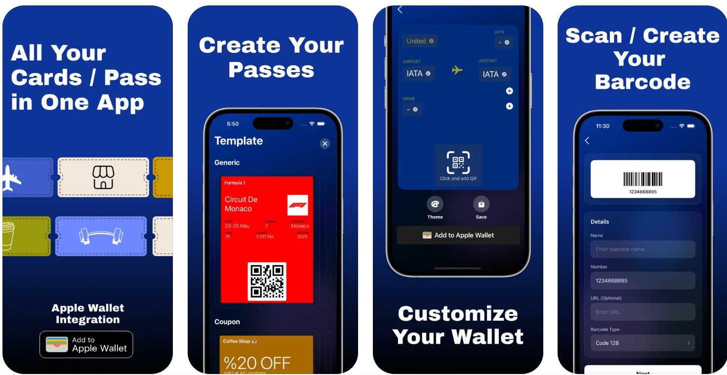 Pass – Customize Your Wallet! With Pass, take control of your Apple Wallet and make it truly yours! Add custom passes to your Apple Wallet, whether it’s boarding passes, membership cards, event tickets, or personalized generic cards. Keep everything