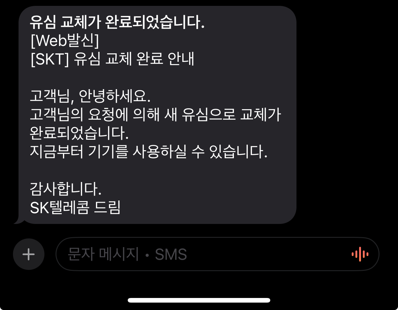 유심 교체가 완료되면, SK텔레콤으로부터 교체 완료 안내 문자를 받게 됩니다.