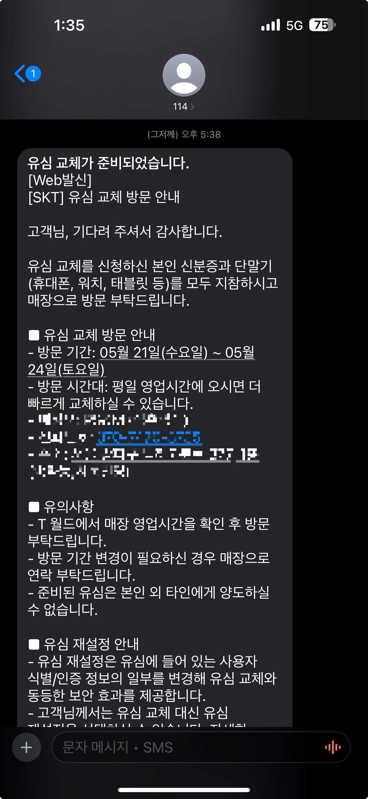 그제 근무 중에 SK텔레콤으로부터 유심 교체 안내 문자를 받았습니다. 문자에는 교체 일정이 5월 21일부터 24일까지로 명시되어 있었고, 지정된 대리점에서 교체하라는 내용이었습니다.