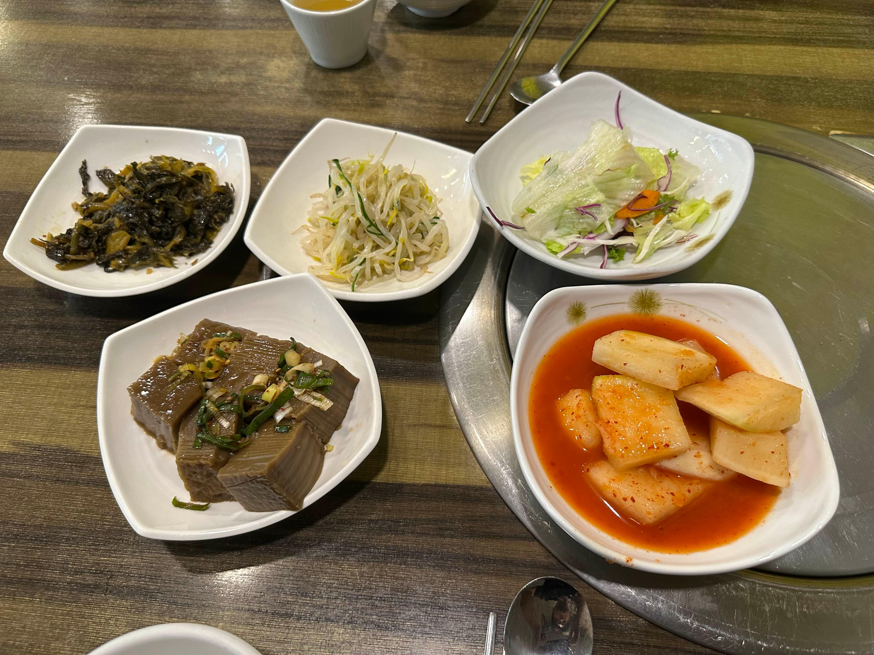 기본 찬으로 시래기무침, 콩나물무침, 묵, 깍두기 그리고 샐러드입니다.