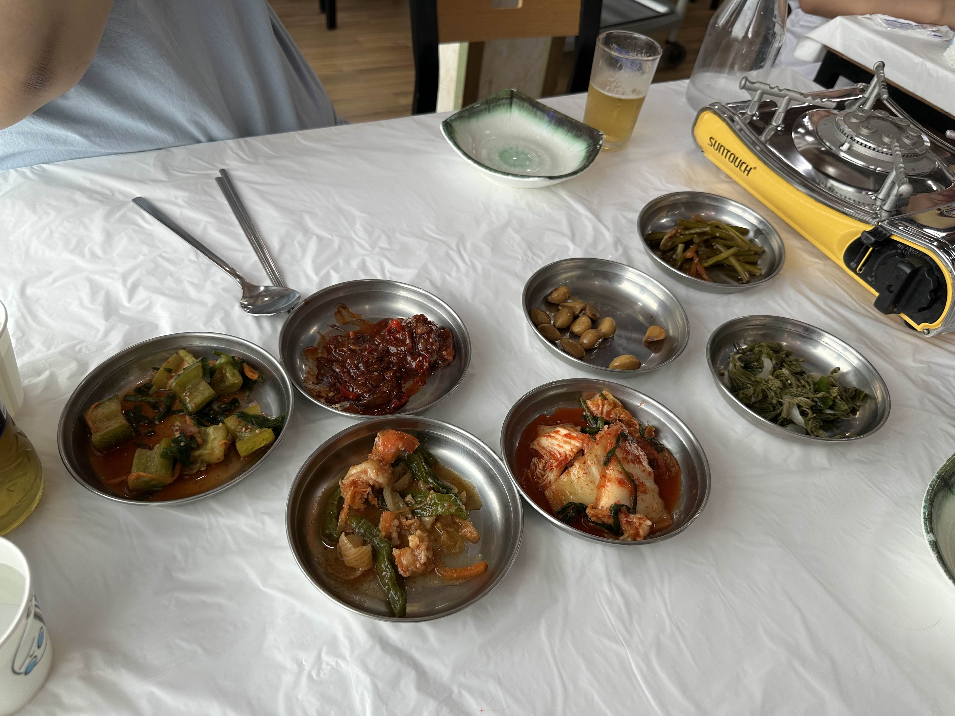 밑반찬으로 오이소박이, 꼴뚜기젓갈, 마늘장아찌, 김치, 나물 2종, 새우와 꽈리고추의 볶음이 준비가 됩니다.