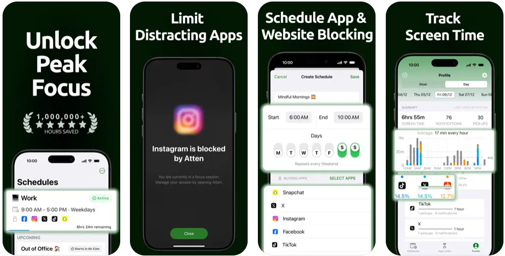 Atten: Block Apps & Limit Screen Time to Stay Focused Atten is a powerful app blocker and website blocker that helps you stay focused, reduce distractions, and take control of your screen time. Whether you want to block apps, limit app usage, or create