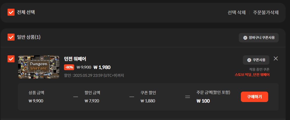 게임 결제 시 1880원 쿠폰이 적용이 되어 최종 100원에 구매가 가능합니다.