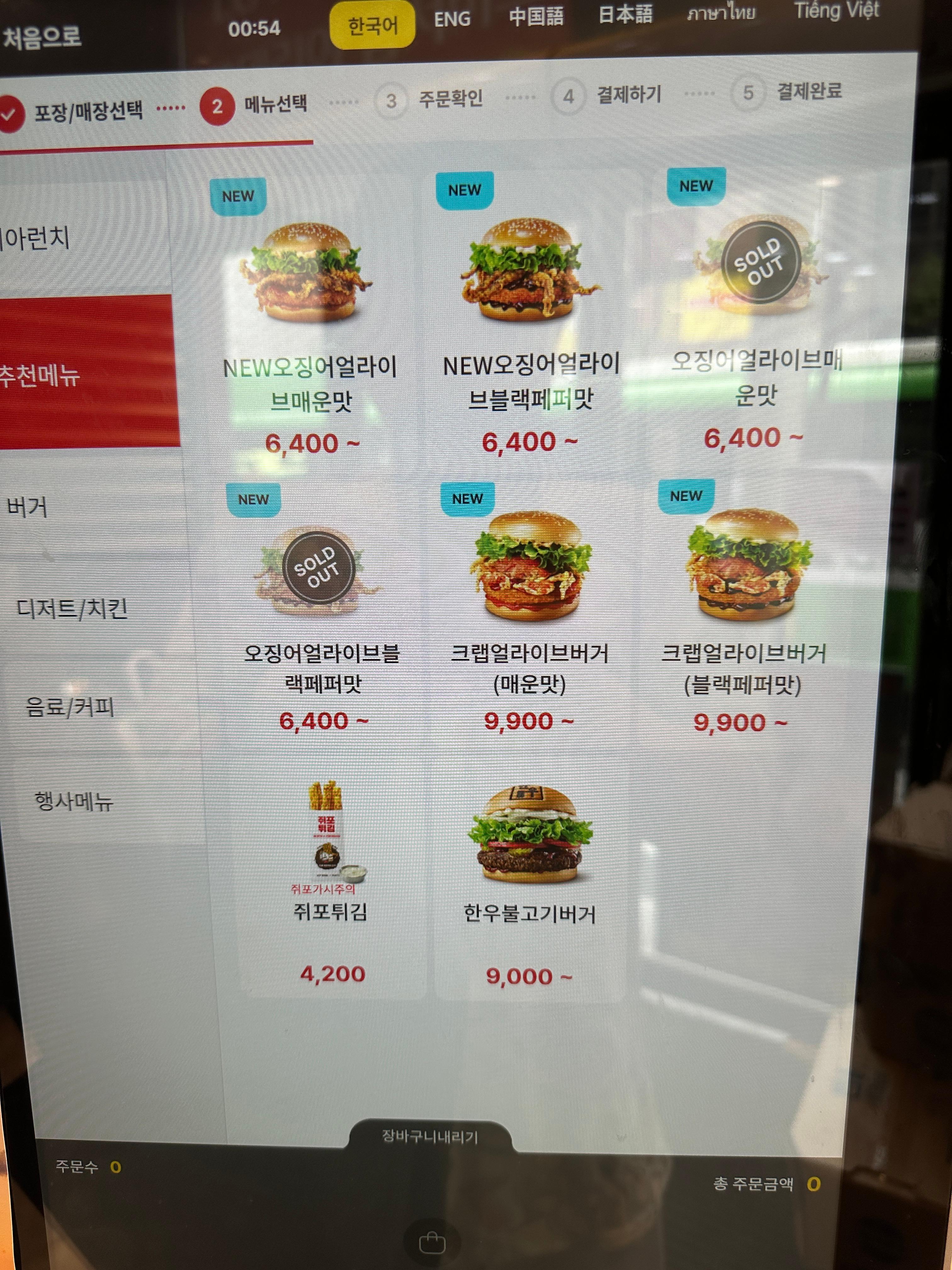 키오스크에서 블랙페퍼맛, 매운맛, 그리고 와이프가 먹을 리아새우버거까지 쓱쓱 담고…