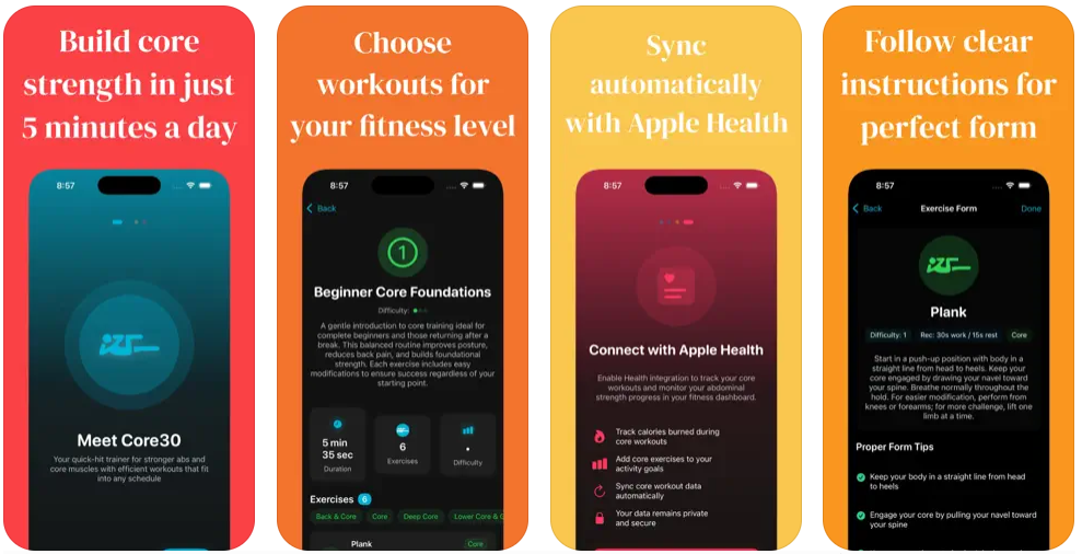 Core30: Quick Ab & Core Workouts Build a stronger core in just minutes a day. Core30 delivers fast, effective ab and core workouts that fit into even the busiest schedule. With focused 30-second exercises and complete routines that take just 5-10 minute