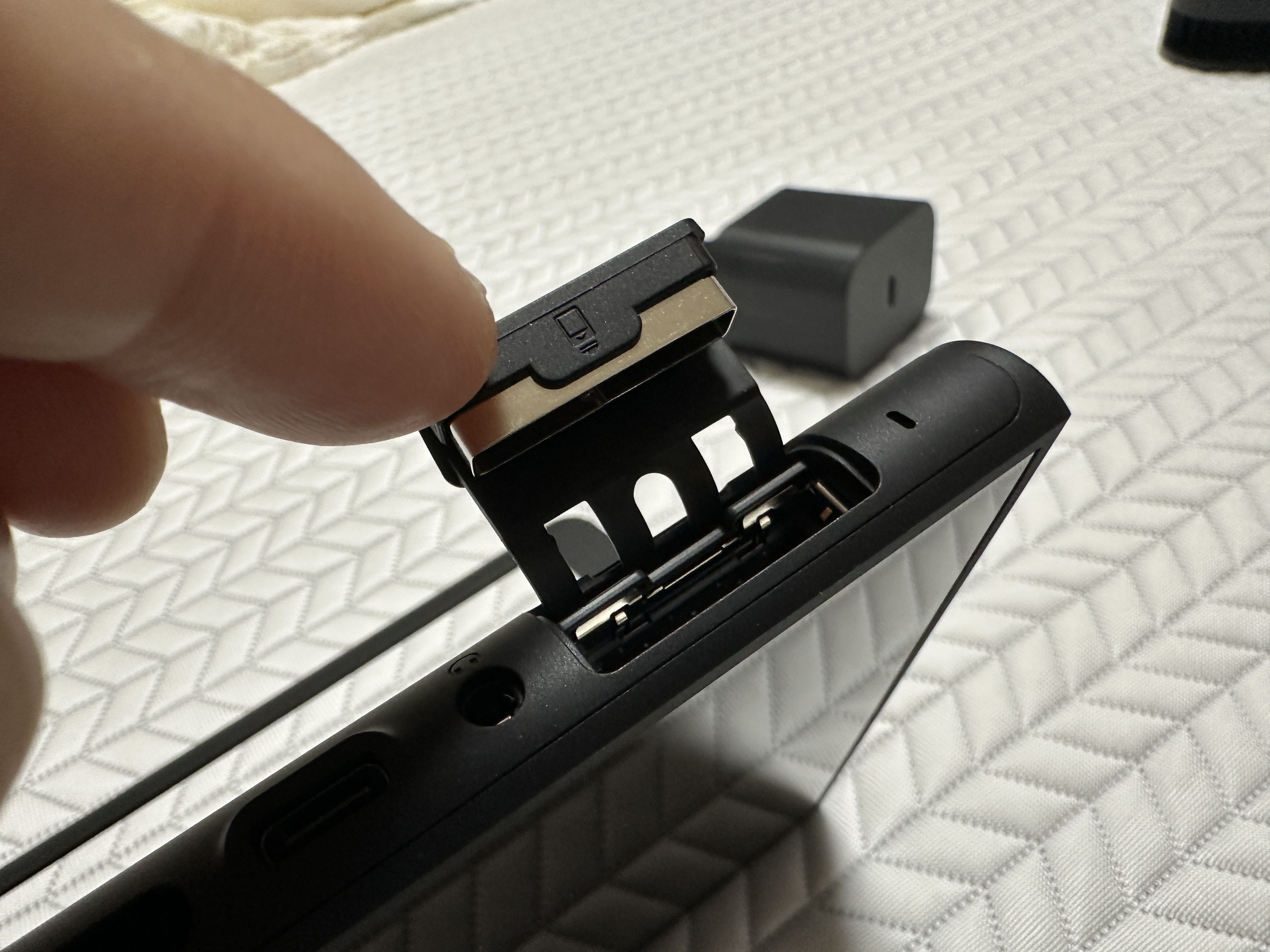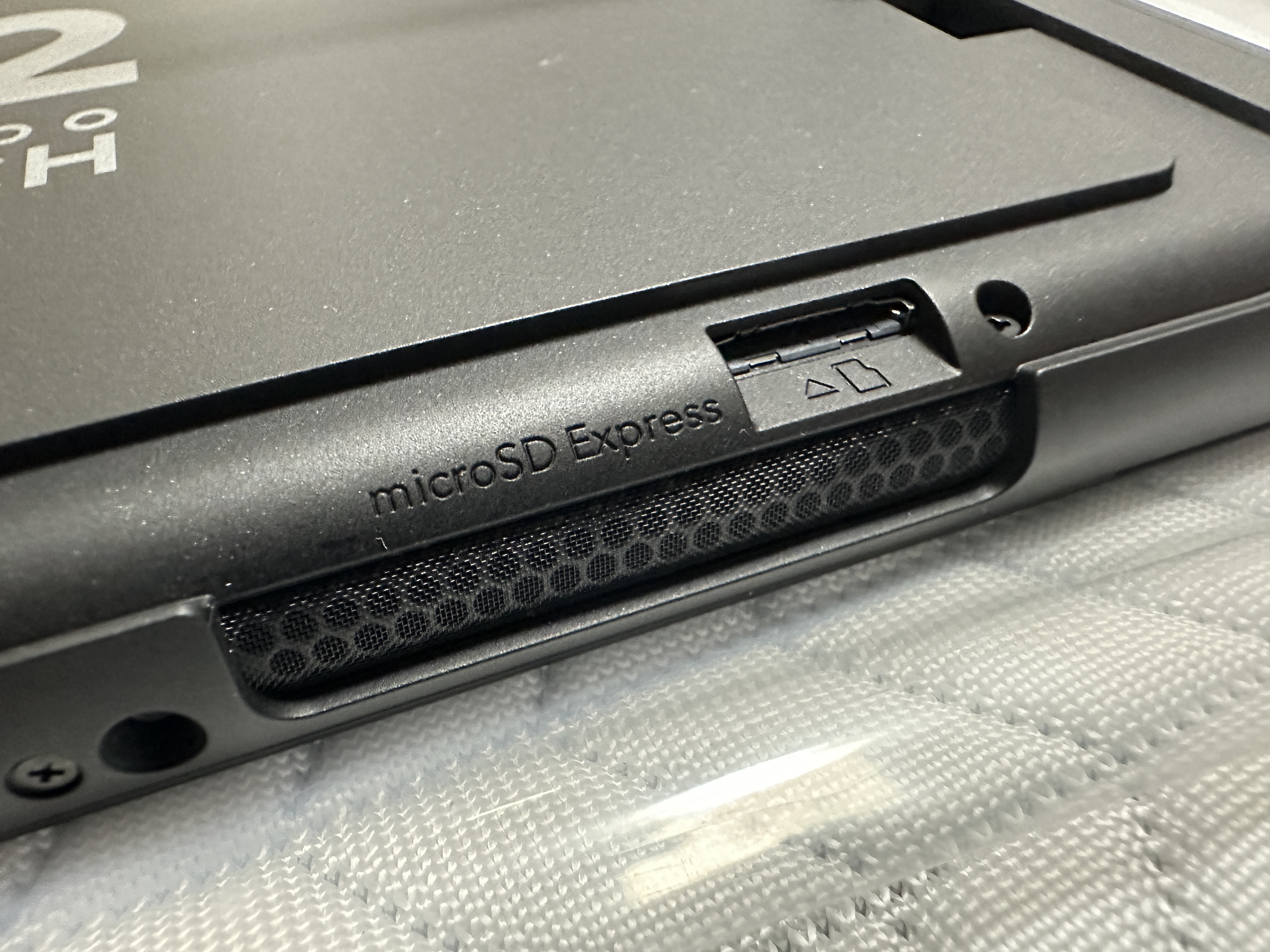거치대를 들어 올리면 메모리카드 slot이 있습니다. 스위치2에서는 마이크로SD가 사용이 되는게 아니라