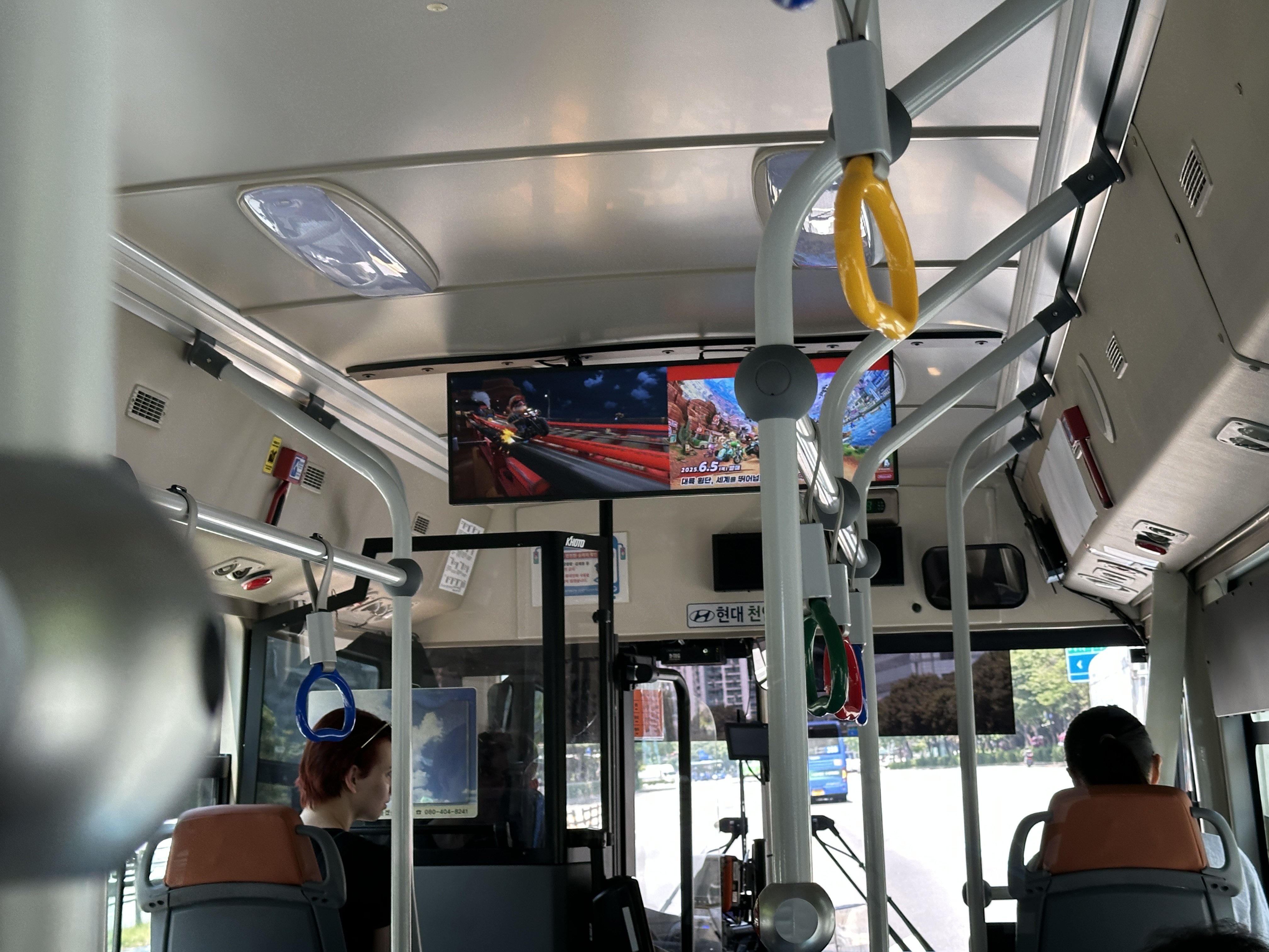 버스 안 LCD 화면에 흐르는 광고는 다름 아닌 스위치2 마리오카트 광고!