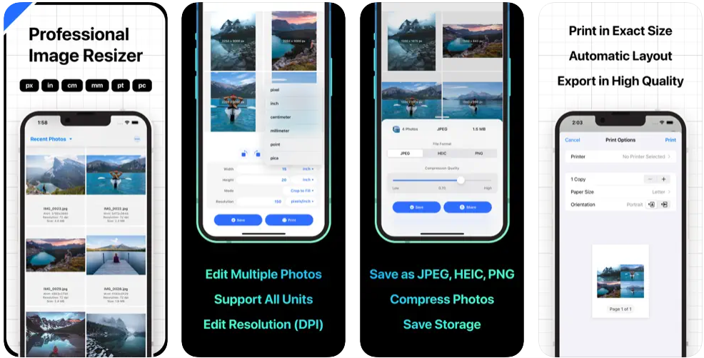 You can use this app to: - Quickly resize and compress multiple photos at once to save your device storage. - Print multiple photos to actual size (inch, cm,...) and save paper. - Quickly rotate or flip multiple photos at once. - Convert your photos to