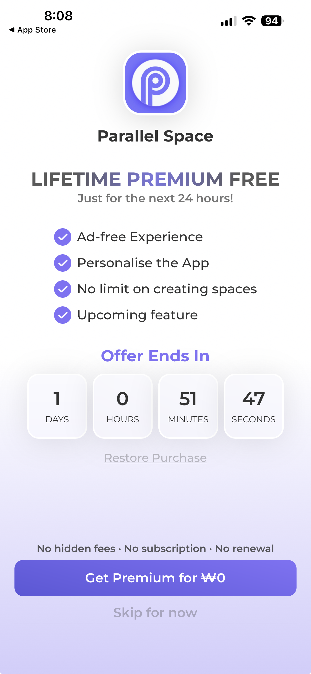 패러럴 스페이스 - 듀얼 계정 앱이 무료 다운로드 프로모션 중 입니다.